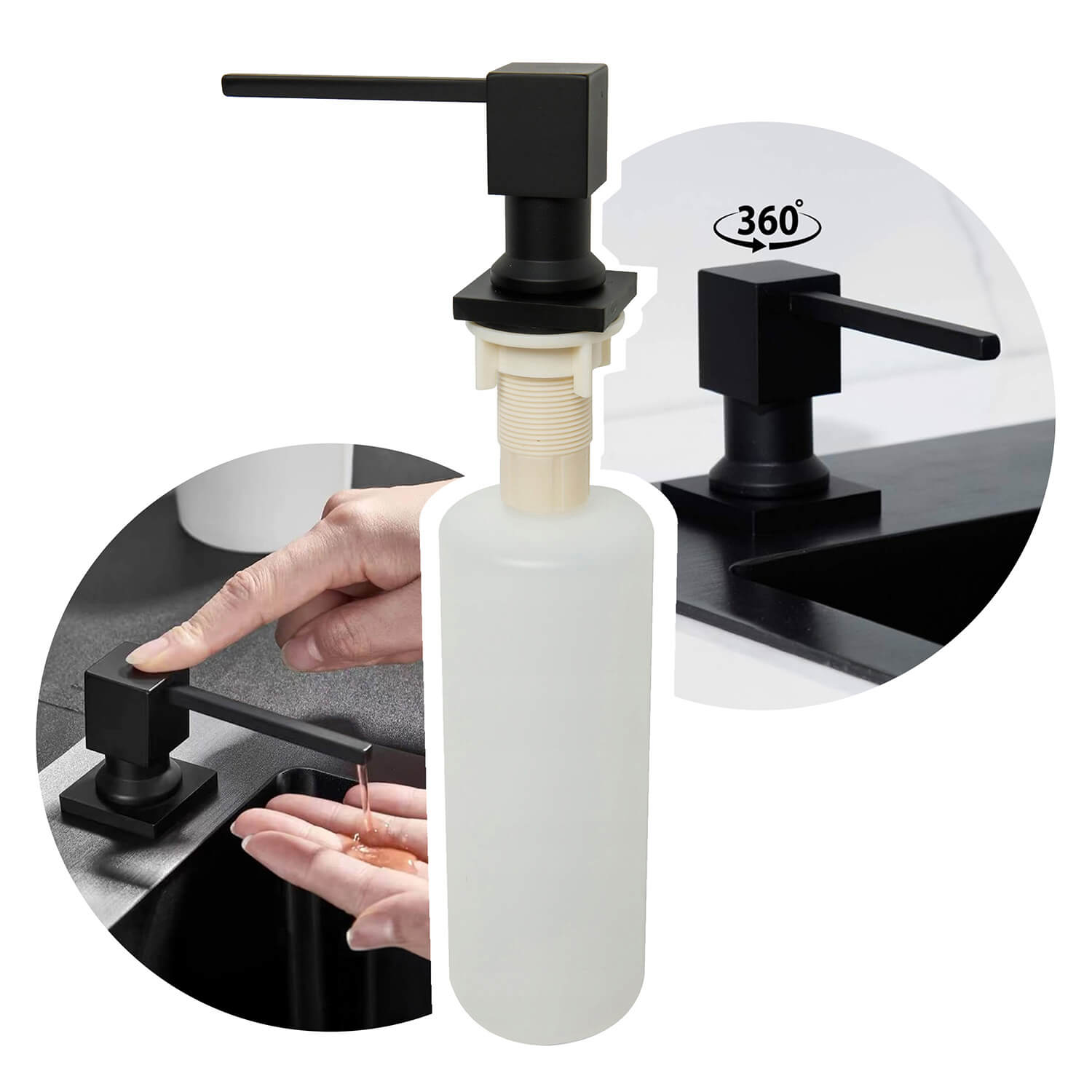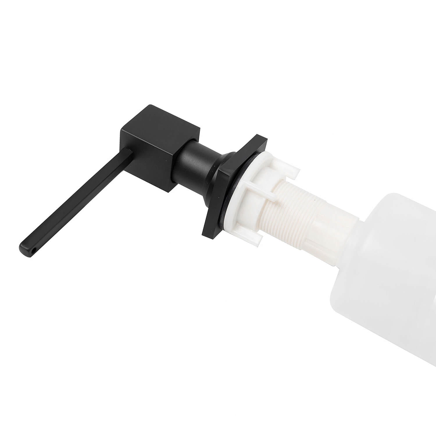 Łatwy montaż bez użycia narzędzi. Łączenie elementów nakrętką z uszczelką zapewnia stabilne utrzymanie dozownika i zapobiega przenikaniu wody pod blat. Dozownik należy zamontować w dedykowanym otworze w zlewie lub umywalce.