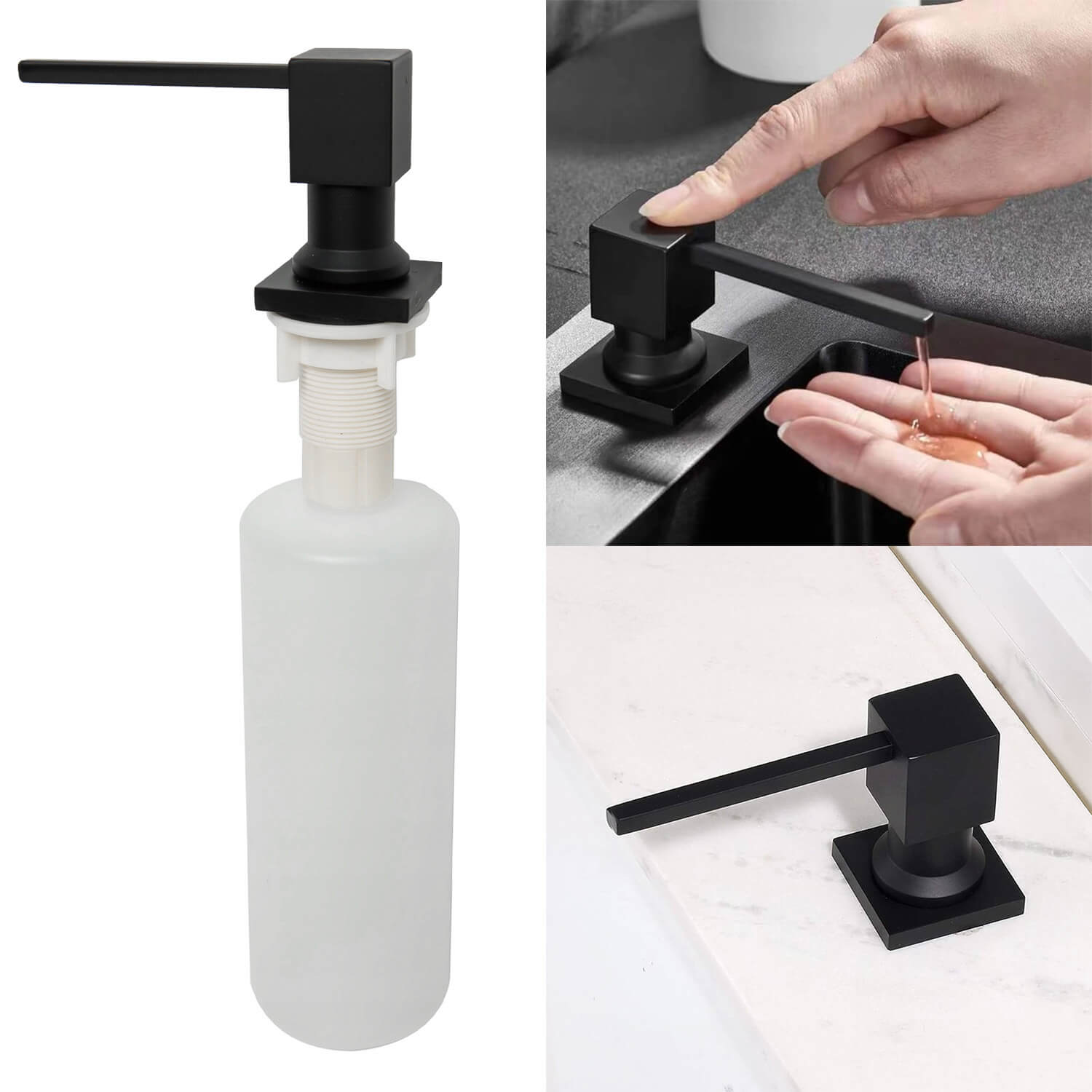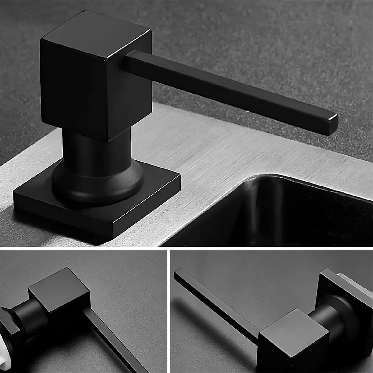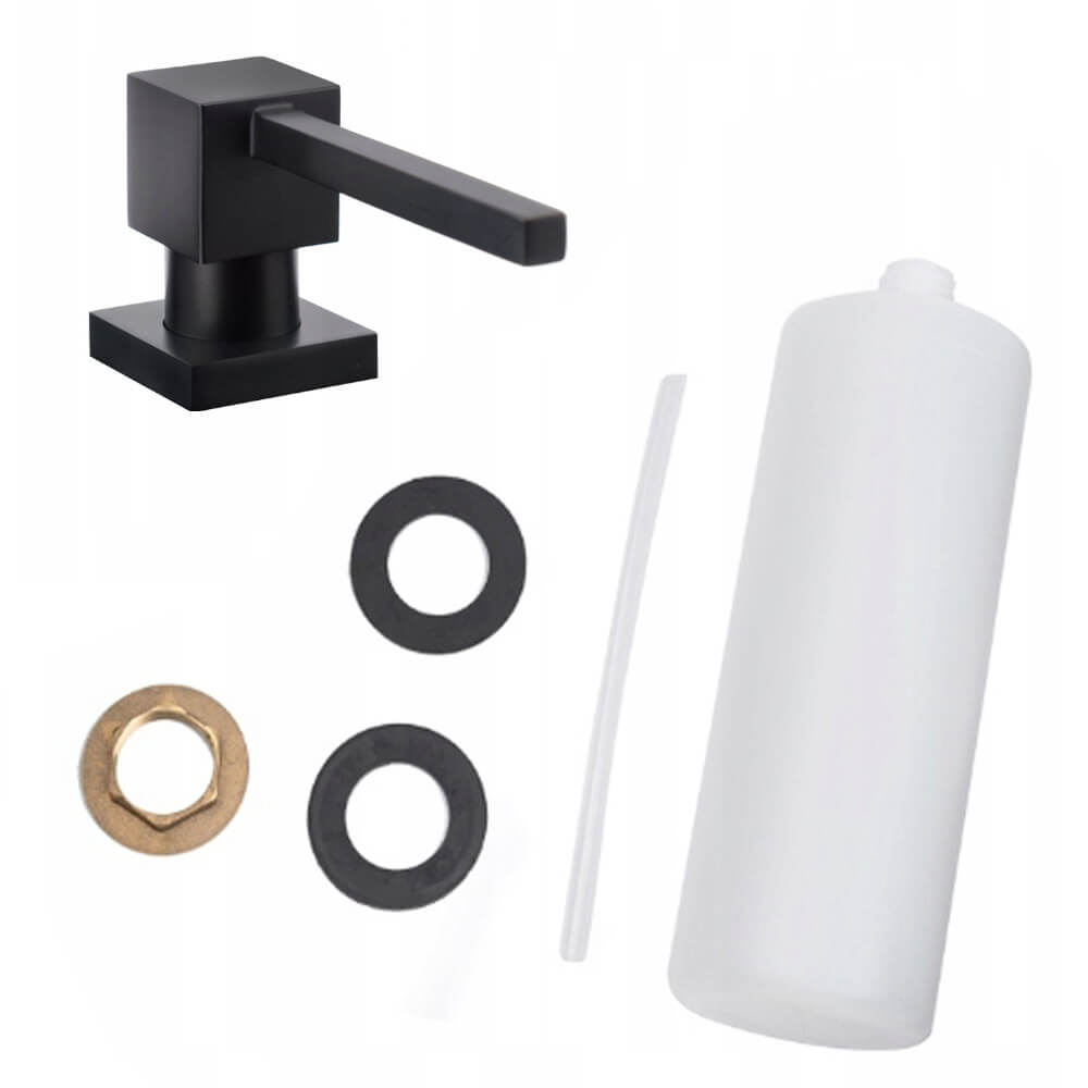 Uniwersalny kwadratowy dozownik do płynu do naczyń lub mydła z pompką o pojemności 400 ml - CZARNY MAT- do zlewu lub umywalki.