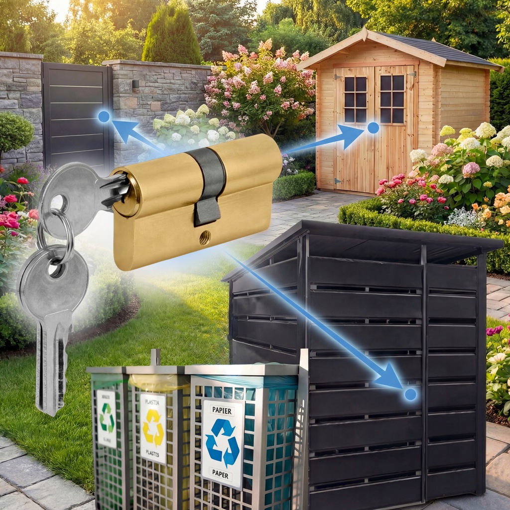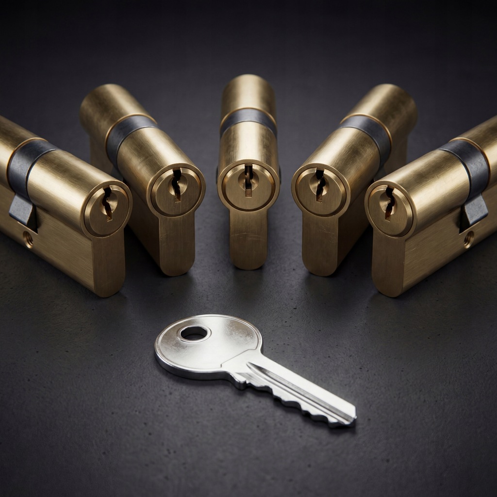 Wkładka bębnowa SYSTEM JEDNEGO KLUCZA z zestawem 5 wkładki z 3 kluczami każda i śrubą mocującą.