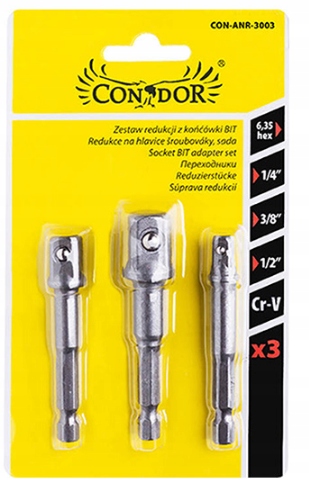 Redukcje pozwalają na pracę wkrętarką z nasadkami. Elementy zestawu wykonane są ze stali narzędziowej, która gwarantuje ich wytrzymałość i długą żywotność.