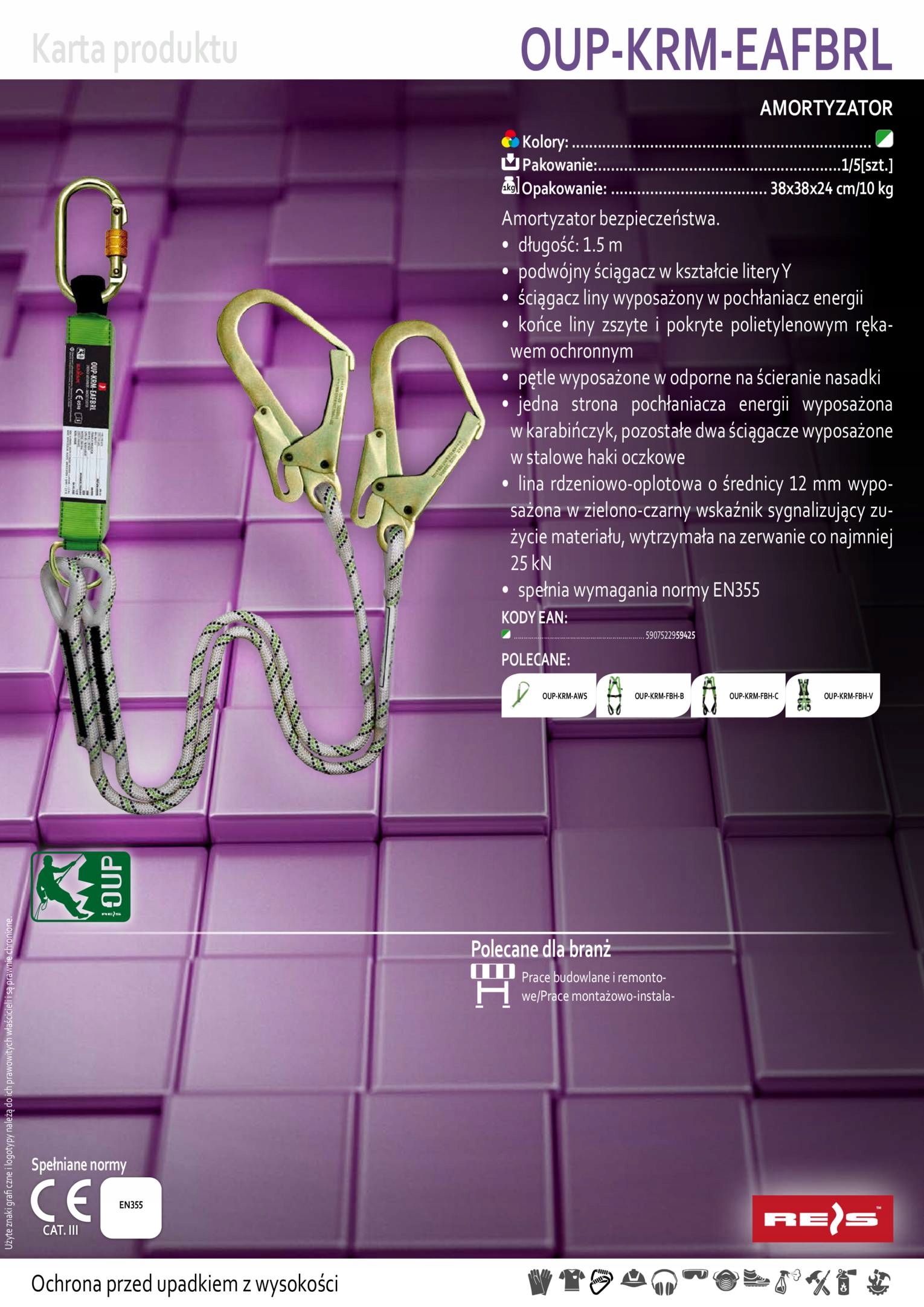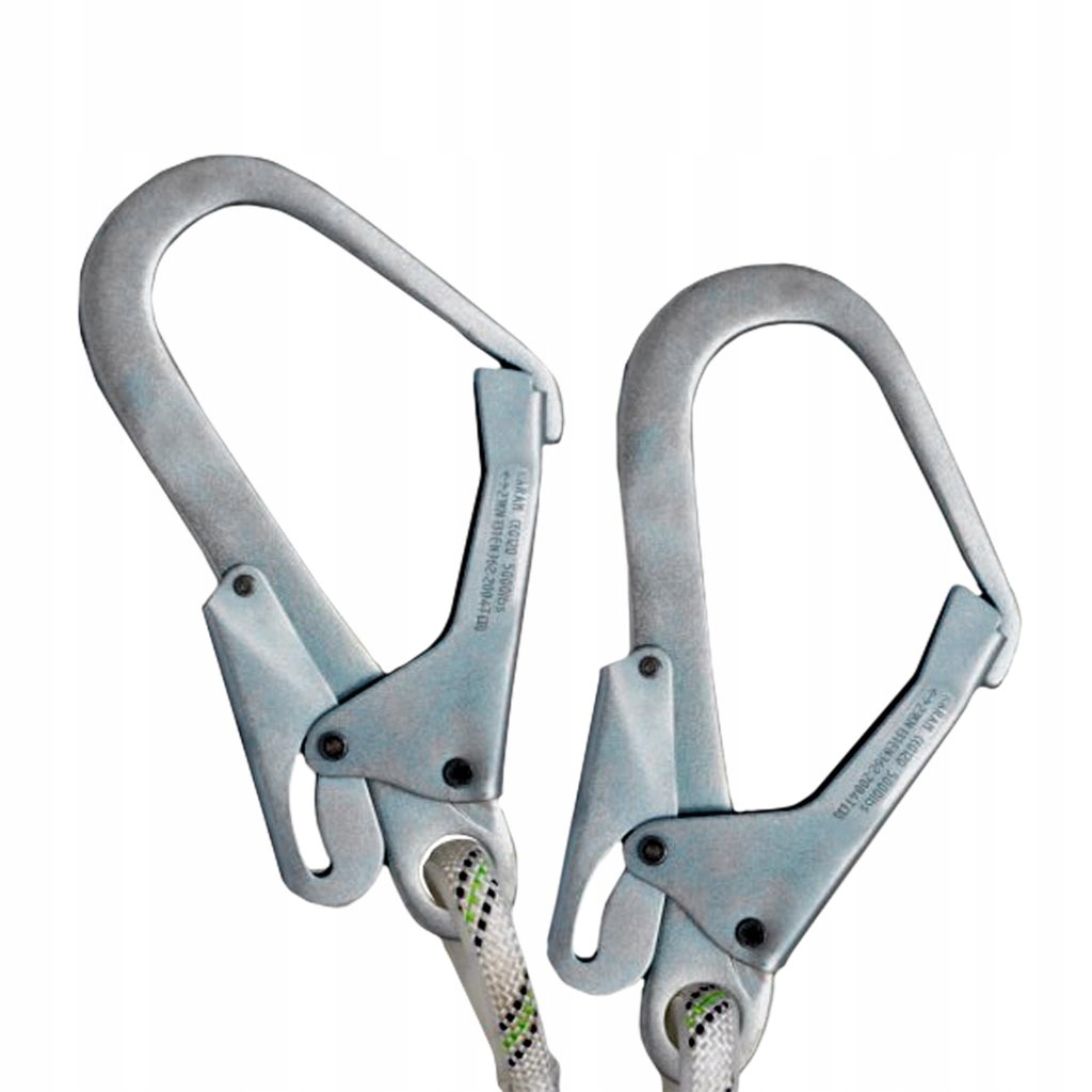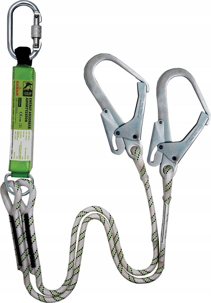 - jedna strona pochłaniacza energii wyposażona w karabińczyk, pozostałe dwa ściągacze wyposażone w stalowe haki oczkowe