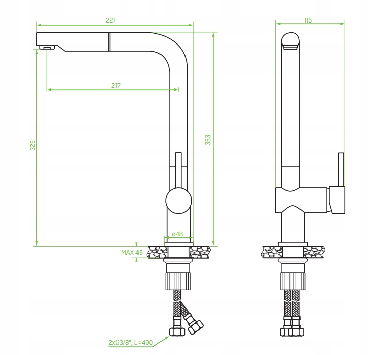 - Długość wężyków przyłączeniowych: 400 mm