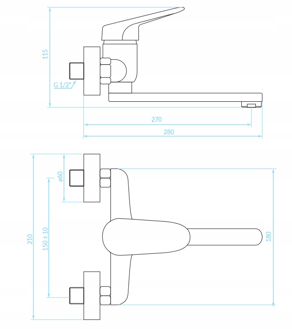 - Zasięg wylewki: 270 mm