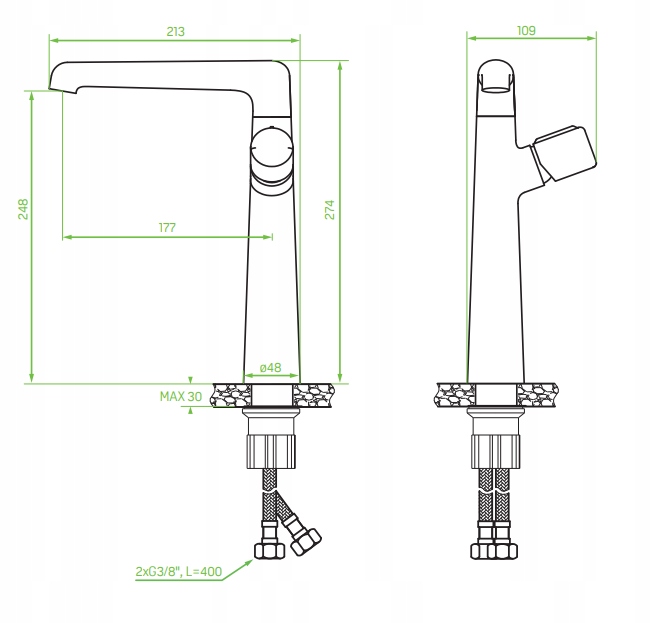 - Długość wężyków przyłączeniowych: 400 mm