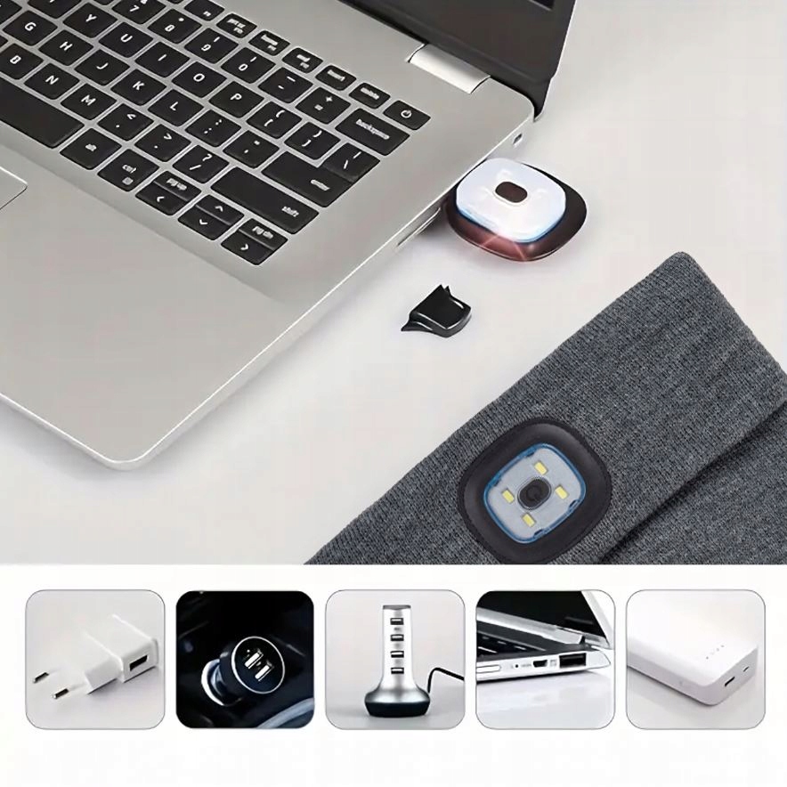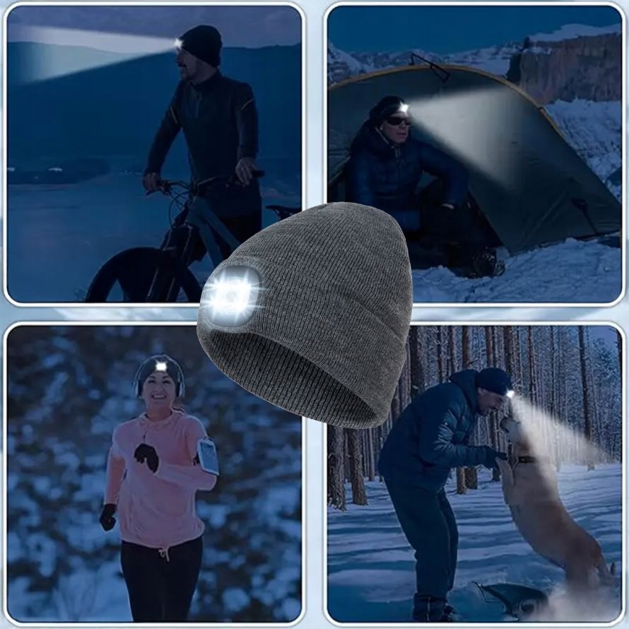⭐ CZAPKA ZIMOWA Z LATARKĄ LED LAMPKĄ CZOŁÓWKA ROBOCZA DO BIEGANIA SZARA