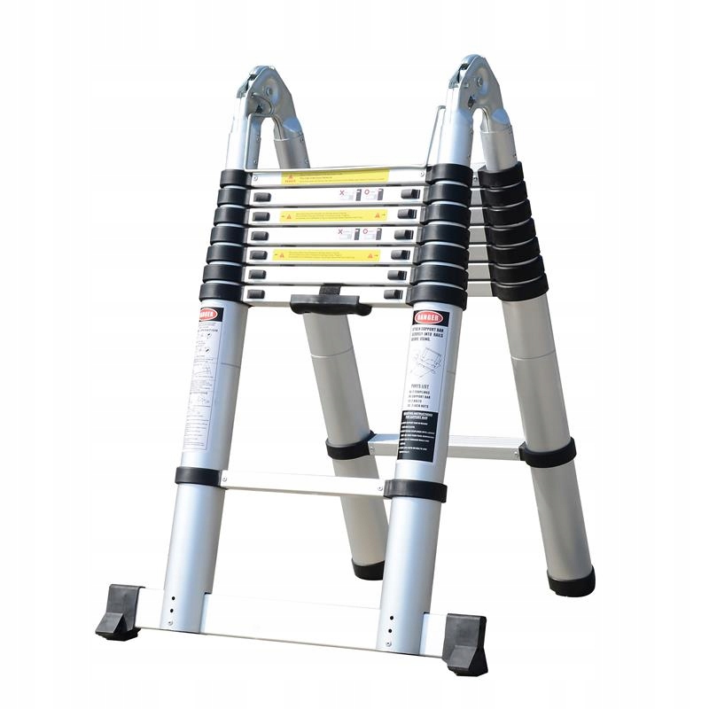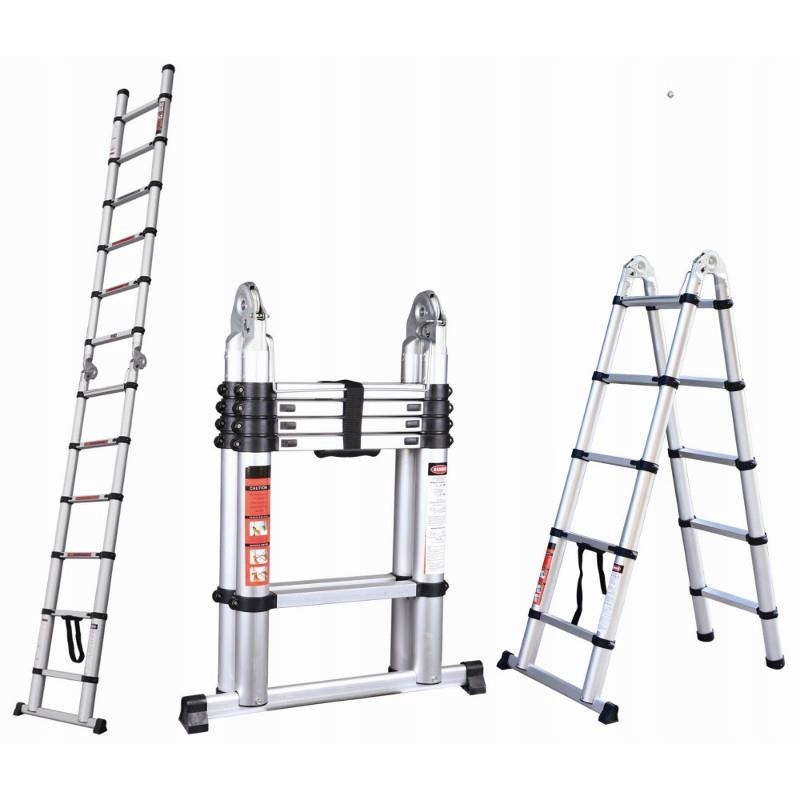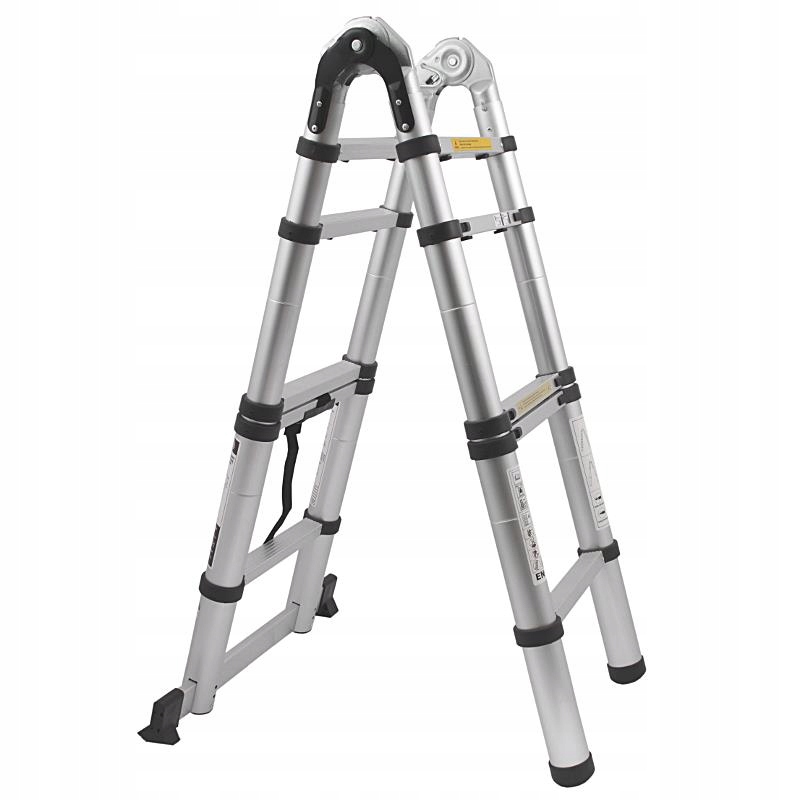 Drabina teleskopowa przegubowa. Aluminiowa konstrukcja jest lekka, wytrzymała i odporna na warunki atmosferyczne. Można używać jako rozstawną lub przystawną. Po złożeniu zajmuje bardzo mało miejsca, co ułatwia przechowywanie.
