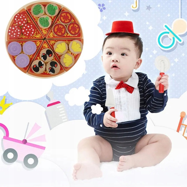 Drewniany zestaw posiada aż 27 elementów, każdy kawałek pizzy, a jest ich aż 6, pozwoli na dowolność. Dodatki przyczepiane są za pomocą rzepów, tak samo jak kawałki, dzięki czemu pizzę można złożyć w całość. Jeden kawałek z brokułem, drugi z pomidorem lub cebulą, to już zależy od wyobraźni naszego małego kucharza. Krojenie czy chwytanie ćwiczą zdolności manualne Twojego dziecka. Cała zabawa wpłynie pozytywnie na jego rozwój.