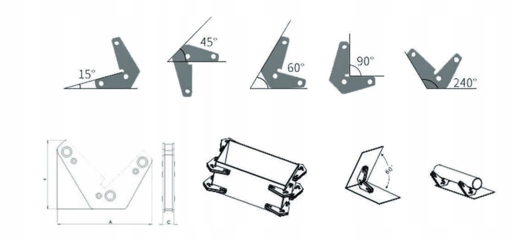 ▶ Zestaw zawiera 2 kątowniki o różnych kątach: 15°, 45°, 60°, 90°, 120° i 240°. Wykonane są one z wytrzymałej stali, co zapewnia solidną konstrukcję.