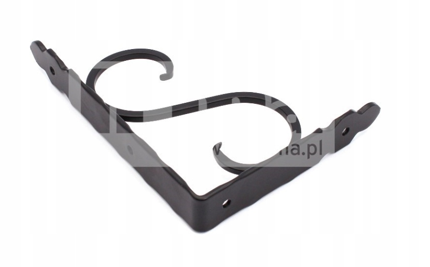 Ozdobny, mocny wspornik pod półkę. Drut kwadratowy. Posiada ornamentowe przetłoczenia na karawędziach kątownika.