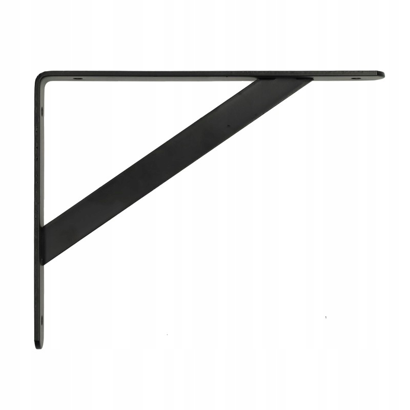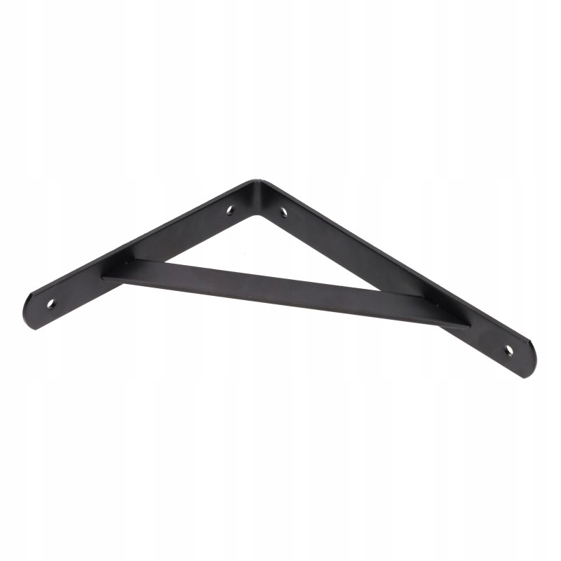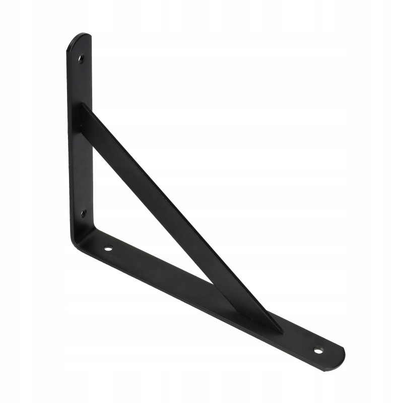 - Metalowy, wzmocniony kątownik/wspornik pod półkę o ramionach 250 x 200 mm i przekroju pasa 30 x 4 mm w kolorze czarnym.