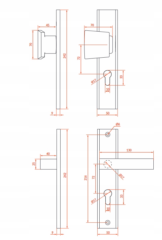 ✔️ Głębokość od szyldu do końca rękojeści: 49/54 mm