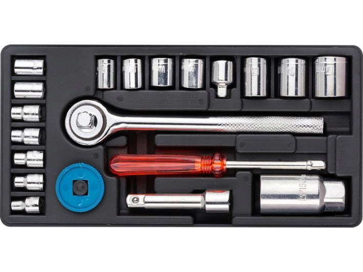 - W skład zestawu wchodzi grzechotka 1/4”, zestaw nasadek 1/4” w rozmiarach 4-17 mm i 3/8” w rozmiarach 13-21 mm, przedłużka oraz osłonka PCV.