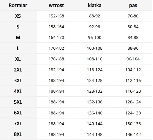 Podane w tabeli dotyczą wymiarów ciała użytkownika, nie wymiarów danego produktu.