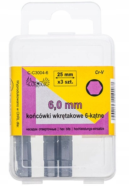 KOŃCÓWKI SZEŚCIOKĄTNE HEX H6 x 25 mm 3szt BIT BITY