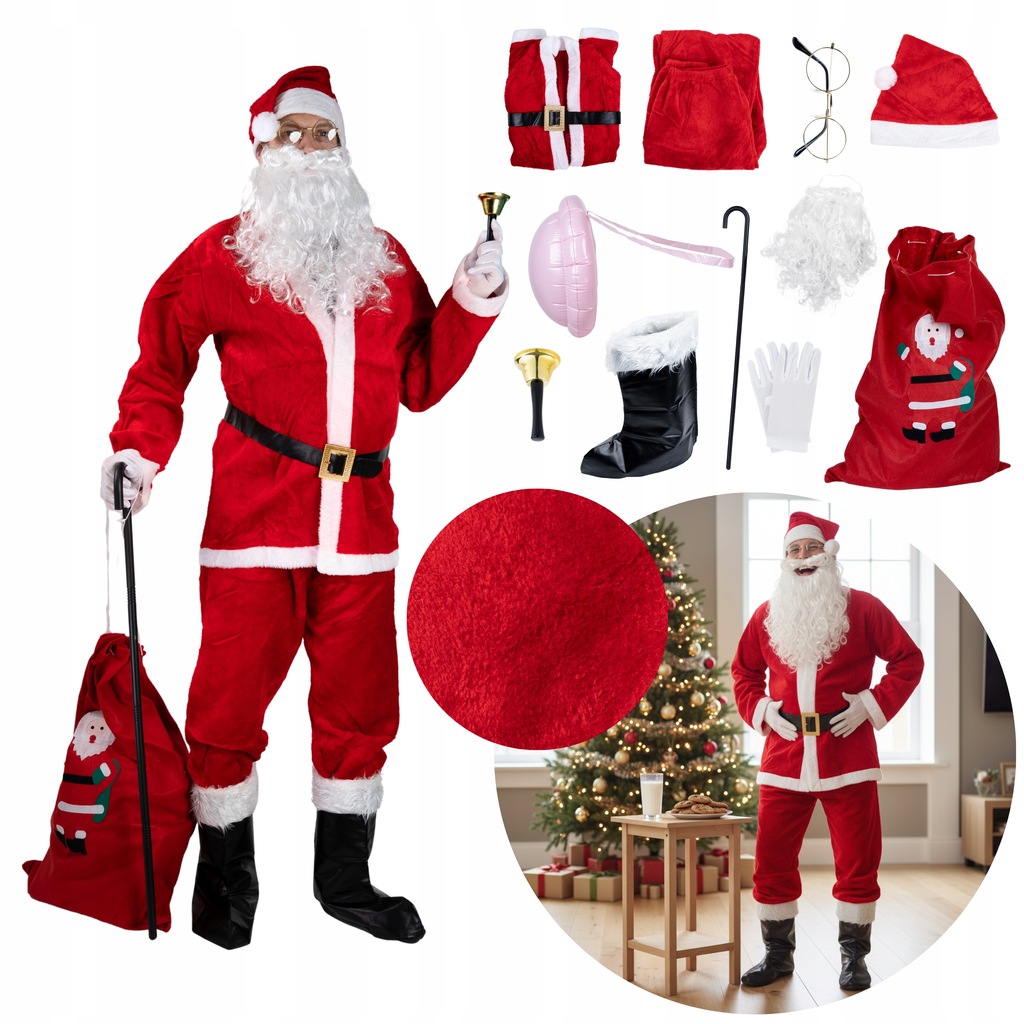 ✓ Profesjonalny strój Świętego Mikołaja wykonany z miękkiego, przyjemnego w dotyku pluszu o głębokim, czerwonym kolorze. Zestaw składa się z aż 12 starannie dobranych elementów, które tworzą pełną, świąteczną stylizację.
