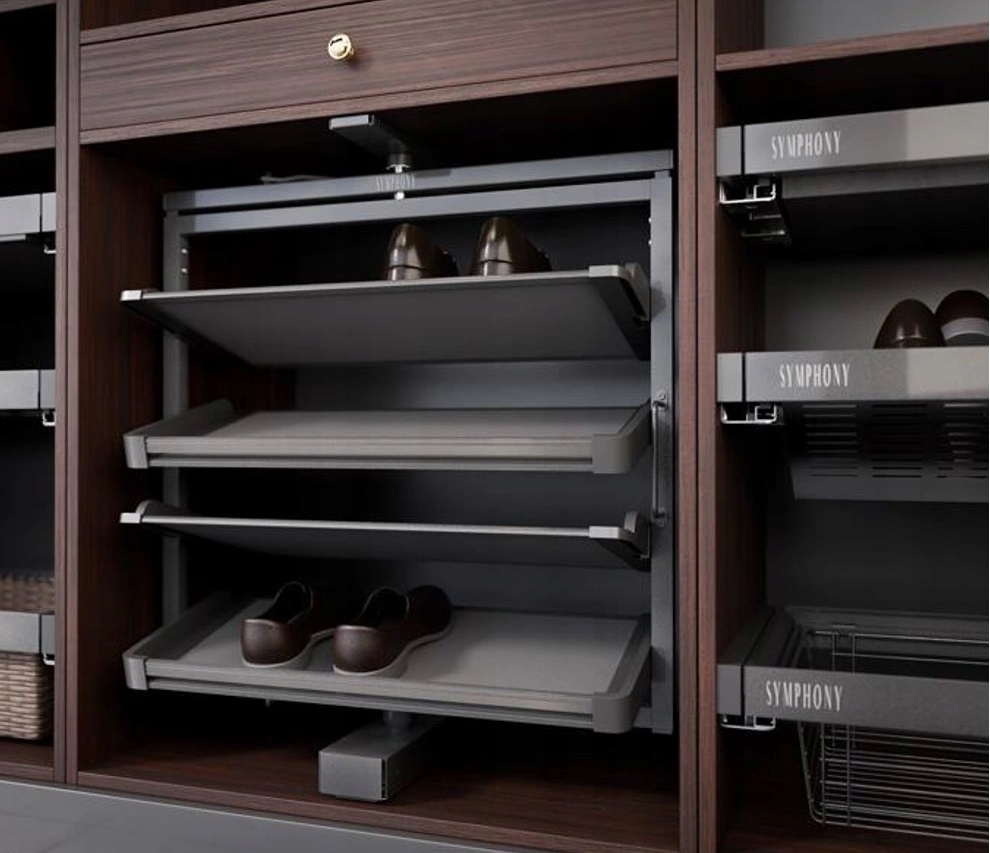 - Obrotowe Półki: pozwala na elastyczną adaptację do indywidualnych potrzeb. Unikalny projekt półek umożliwia łatwy dostęp do przechowywanych butów z obu stron, maksymalizując przy tym wykorzystanie dostępnej przestrzeni.