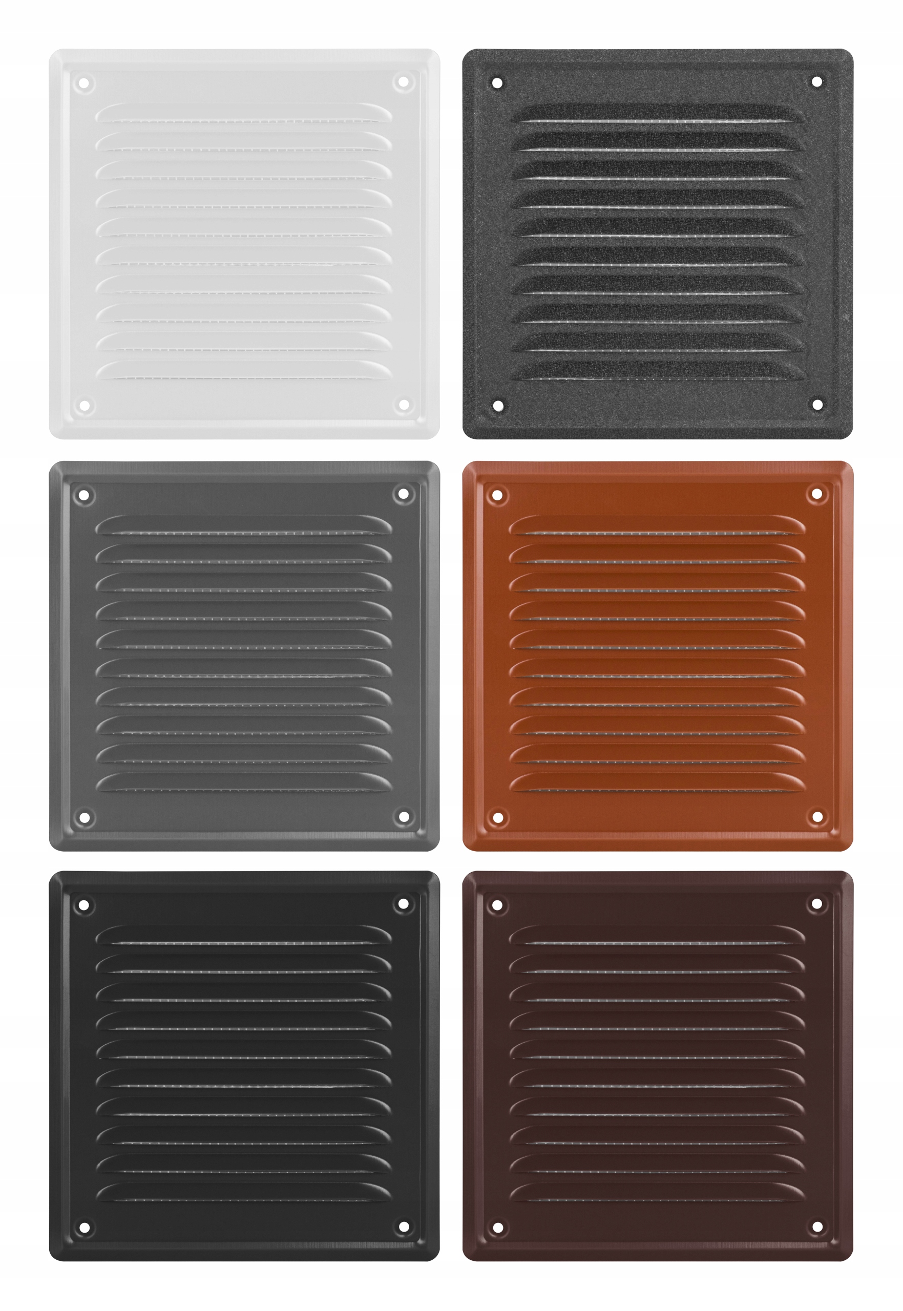 Metalowa płaska kratka ze skośnymi żeberkami. Wykonana z blachy cynkowanej malowanej. Powierzchnia zabezpieczona folią. Wersja z otworami – przykręcana.