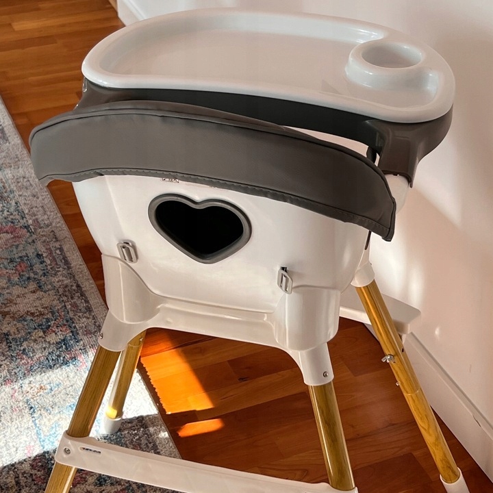 Regulowany 3 stopniowy blat ze zdejmowaną tacką zapewnia komfort w próbach samodzielnego jedzenia.