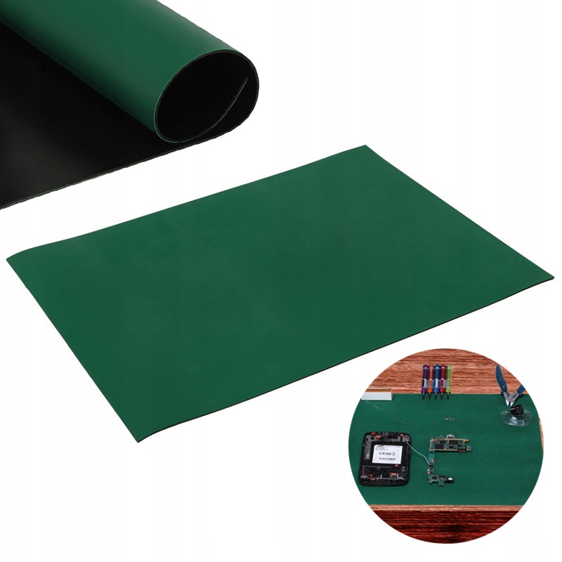 ▶ Mata antystatyczna przydatna podczas serwisowania różnego rodzaju urządzeń, elektroniki czy lutowania. Pełni funkcję przewodnika odprowadzając ładunki elektrostatyczne położonych na niej przedmiotów.