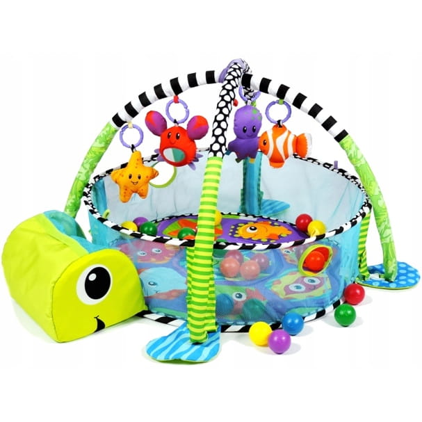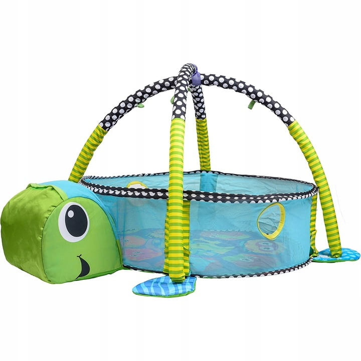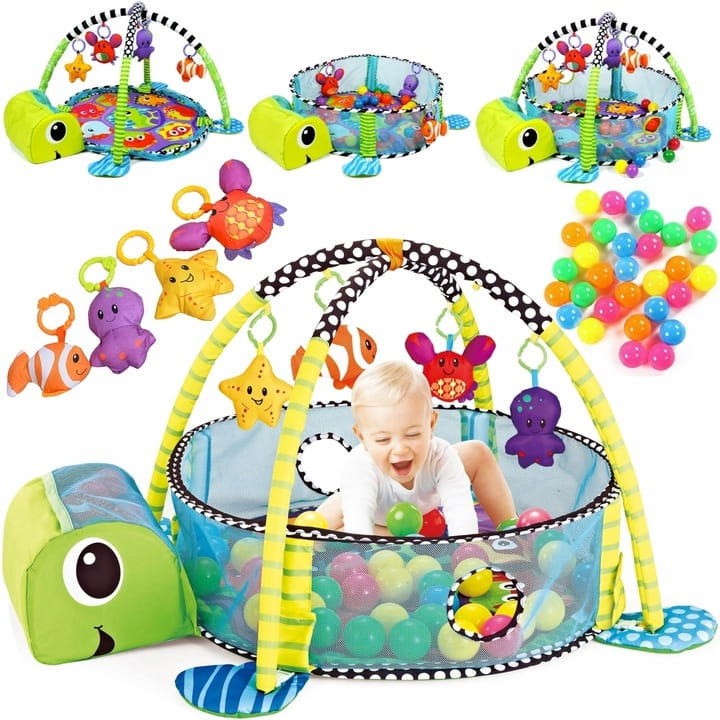- W skład kojca wchodzą grzechotki, karuzela z uroczymi wzorami i miękkie piłki do zabawy, które są idealne dla młodszego dziecka.
