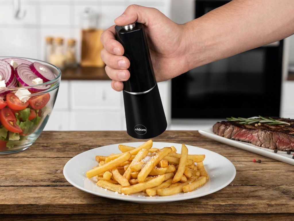 Świeżo zmielony pieprz lub sól potrafią całkowicie odmienić smak potraw. To elegancki, elektryczny młynek do przypraw, który sprawia, że doprawianie dań staje się szybkie, wygodne i niezwykle precyzyjne.