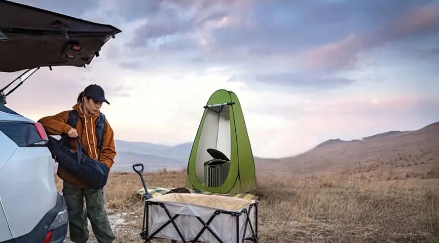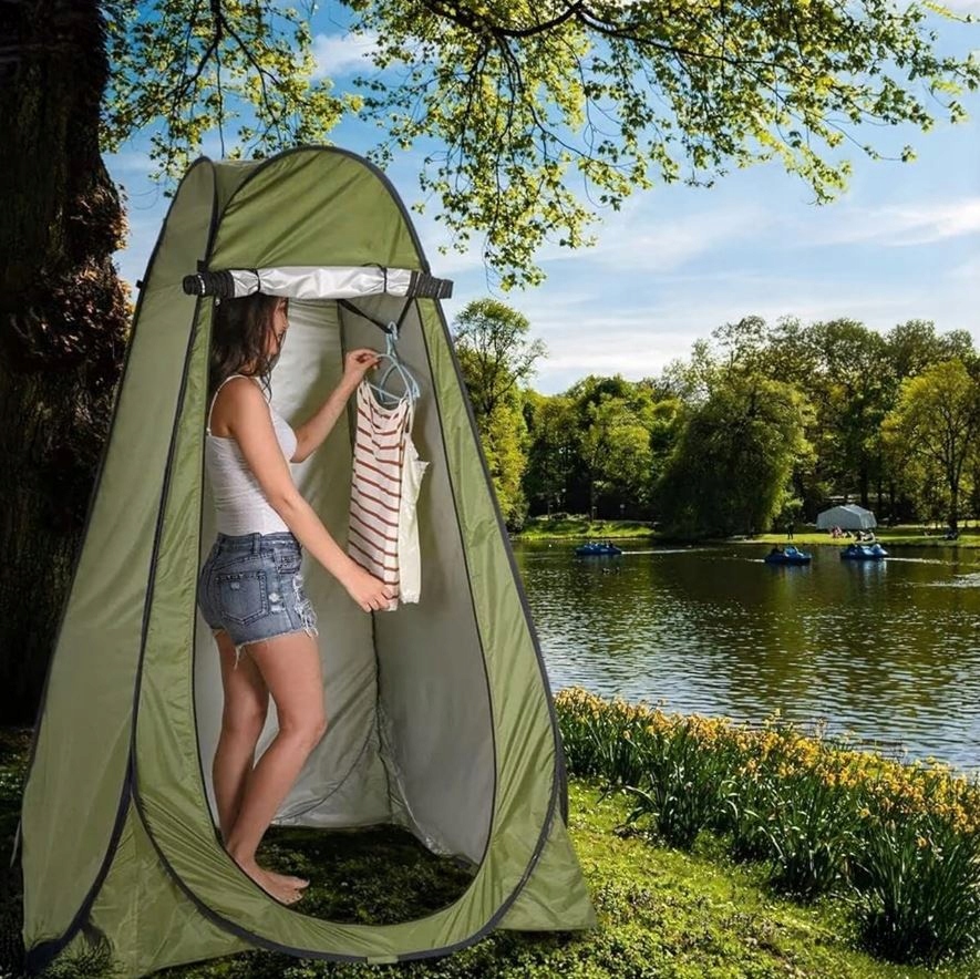 - Namiot prysznicowy – idealny na kempingach z prysznicem turystycznym.