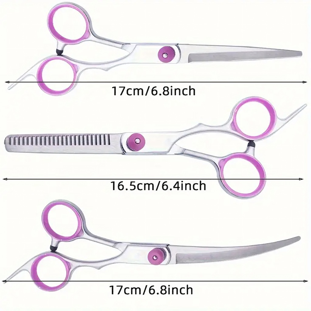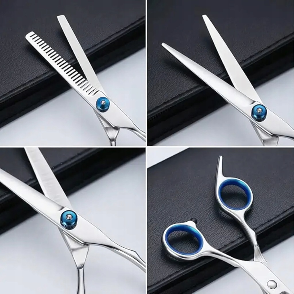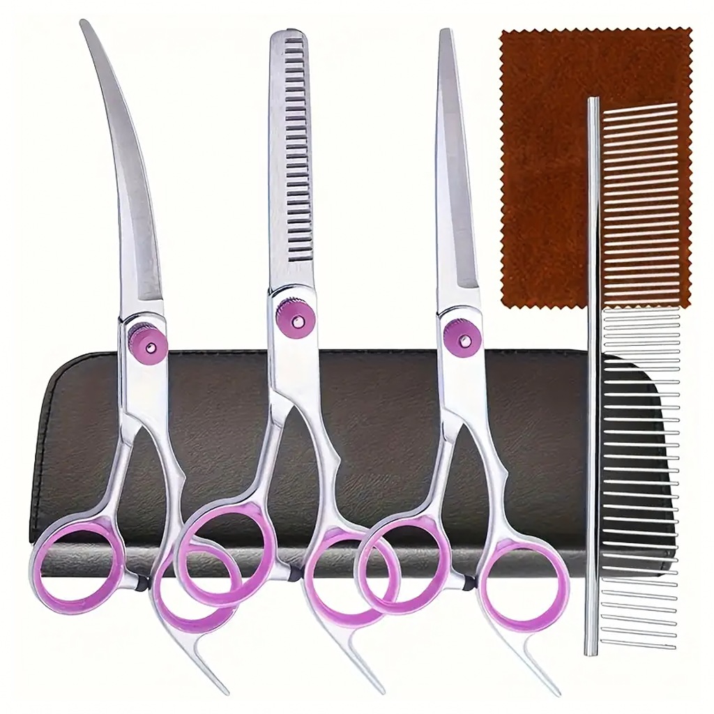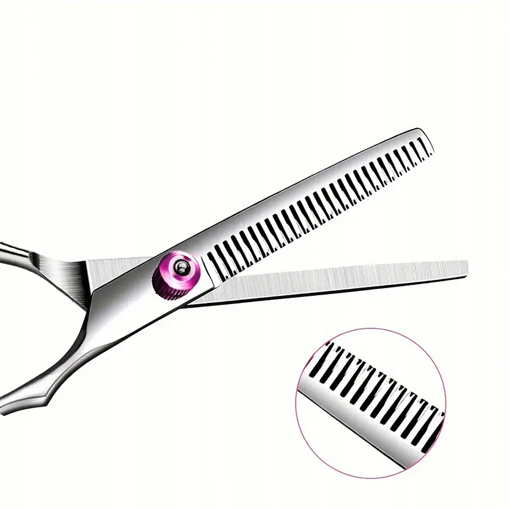 Kompletny zestaw – 3 rodzaje nożyczek (proste, zakrzywione, cieniujące) + grzebień + eleganckie etui.