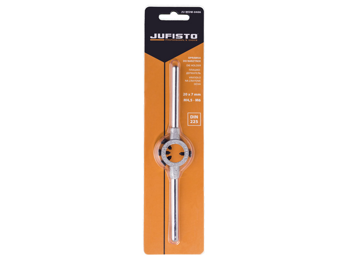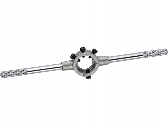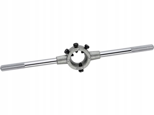 Oprawka to element niezbędny podczas utrzymywania narzynka przy nacinaniu gwintów. Produkt wykonano ze stali, której istotną zaletą jest przede wszystkim wytrzymałość.