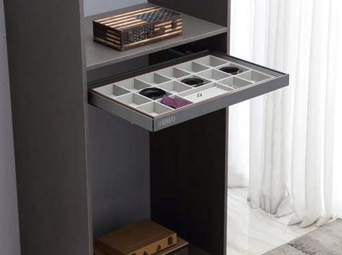 - Wysuwany organizer z serii ATM Symphony, na drobne akcesoria takie jak paski, krawaty, biżuteria czy zegarki, przeznaczony do montażu w szafie lub garderobie.