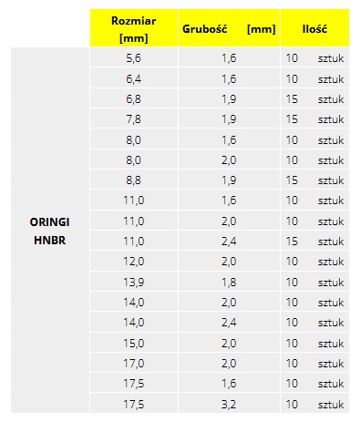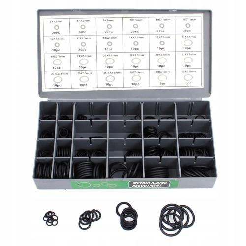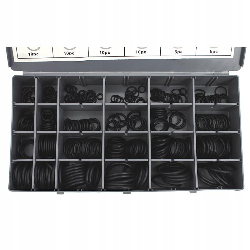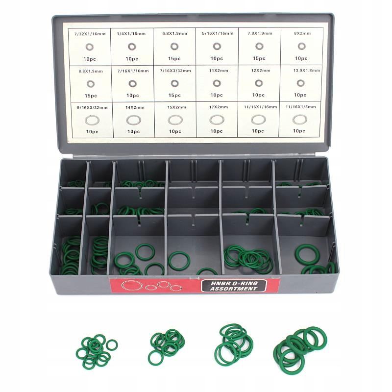 ☑️ Zestaw 900 sztuk oringów i uszczelek. W zestawie znajdują się oringi: metryczne NBR, SAE, HNBR. Kauczuk HNBR charakteryzuje się odpornością na wysokie temperatury, smary, oleje, paliwa diesel, benzynę, mieszanki glikowi z wodą, rozcieńczone kwasy, zasady i sole.