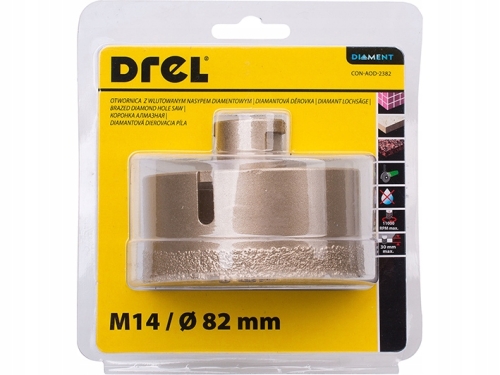 Wiertło diamentowe 82 mm posiada nasyp diamentowy wlutowany. Przeznaczone jest do wiercenia na mokro we wszelkiego rodzaju materiałach mineralnych: ceramika, glazura, terakota, gres, marmur itp. Nasyp lutowany charakteryzuje się dłuższą żywotności, a przez co można wywiercić takim wiertłem większą ilość otworów.