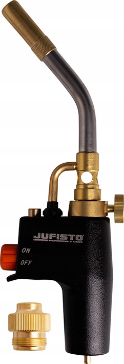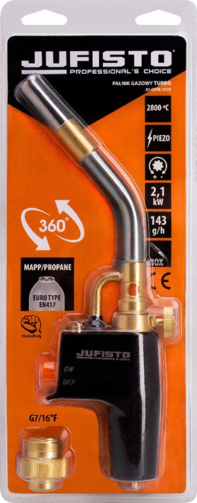 Profesjonalny palnik gazowy z zapłonem piezo, zasilany gazem propan lub mieszaniną MAPP z zewnętrznej butli z gwintem G7/16"F, którą można podłączyć za pomocą znajdującego się w zestawie adaptera.