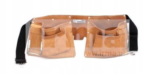Profesjonalny pas monterski. Kieszenie na narzędzia, gwoździe, ołówki, miarkę. Skórzane uchwyty na młotki. Wykonany z grubej jasnej skóry, która nie brudzi ubrania. Produkt polski.