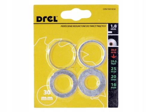 Zestaw pierścieni redukcyjnych do pił i tarcz tnących. Zastosowanie pierścieni pozwala na zredukowanie otworu wewnętrznego ( montażowego ) z 30 mm do pożądanej średnicy. Niezbędne w przypadku stosowania jednego rodzaju tarczy w wielu różnych urządzeniach gdzie występują różne otwory montażowe.