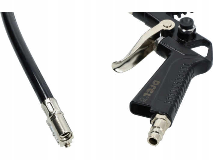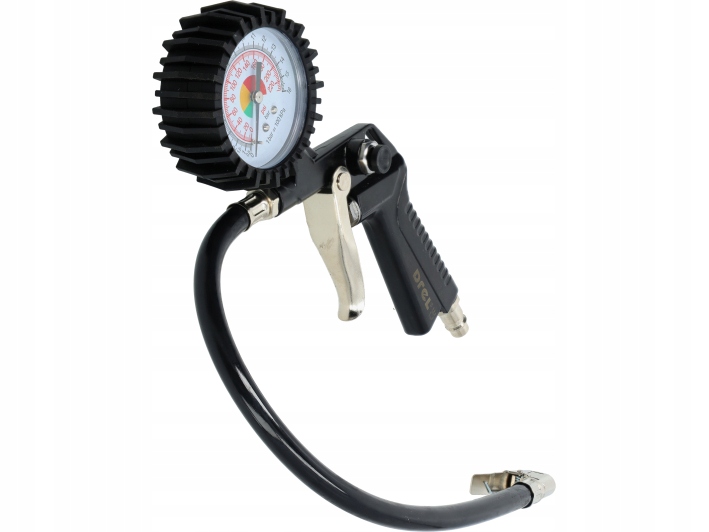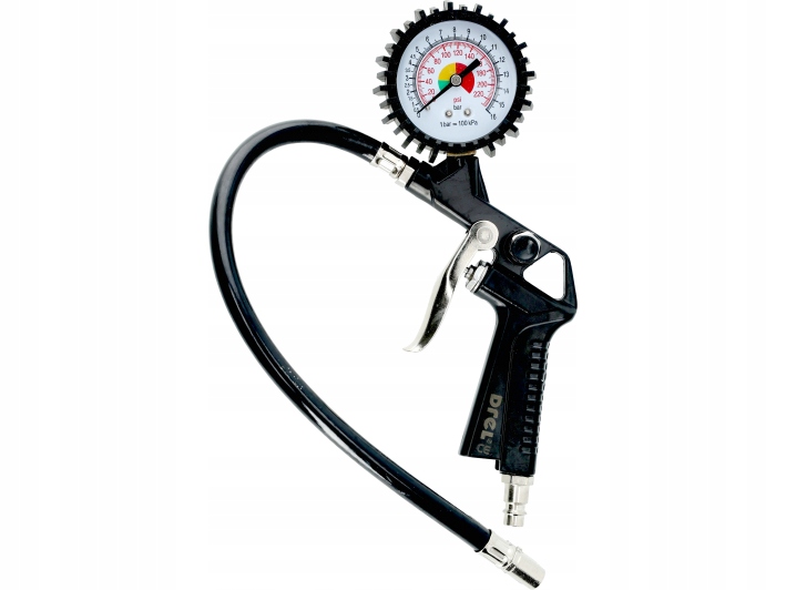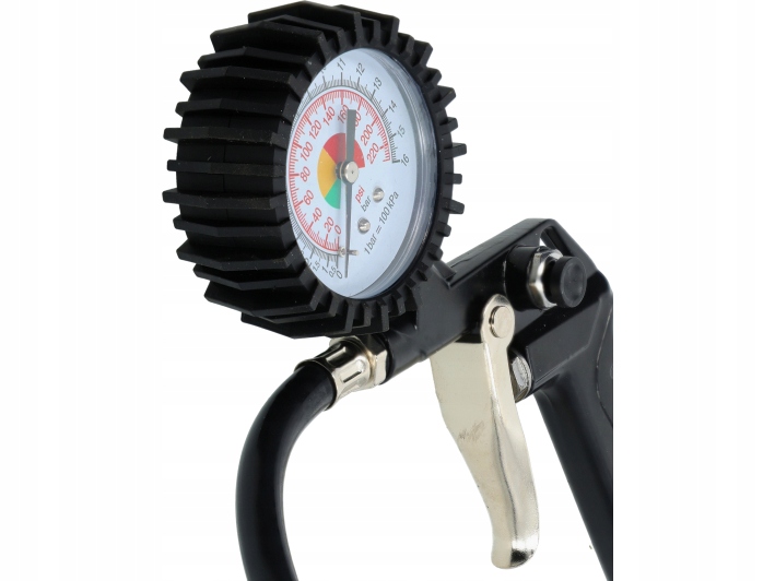 Pistolet składa się z rękojeści, węża o długości 37 cm, dyszy do podłączania do wentyla oraz manometru, który pokazuje aktualne ciśnienie w oponie lub innym obiekcie.