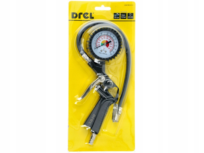 Pistolet do pompowania z manometrem, wąż L-37 cm, to narzędzie pneumatyczne używane do pompowania opon i innych przedmiotów wymagających sprężonego powietrza. Posiada wbudowany manometr, który pozwala na monitorowanie ciśnienia podczas pompowania, co umożliwia precyzyjną kontrolę procesu.