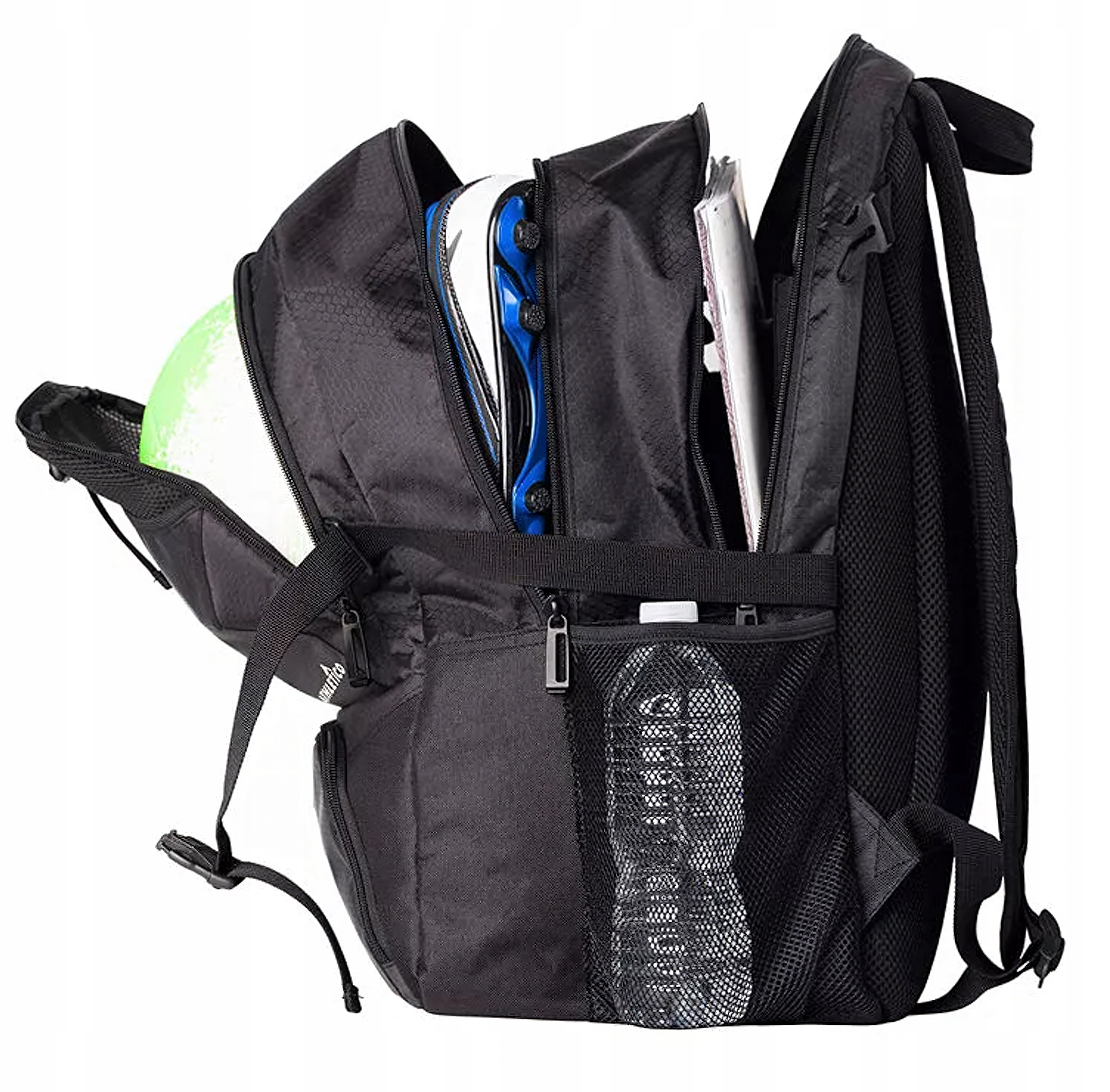 - Praktyczny design: Dwie komory zewnętrzne zapewniają wygodne miejsce na piłkę i buty, co ułatwia organizację.