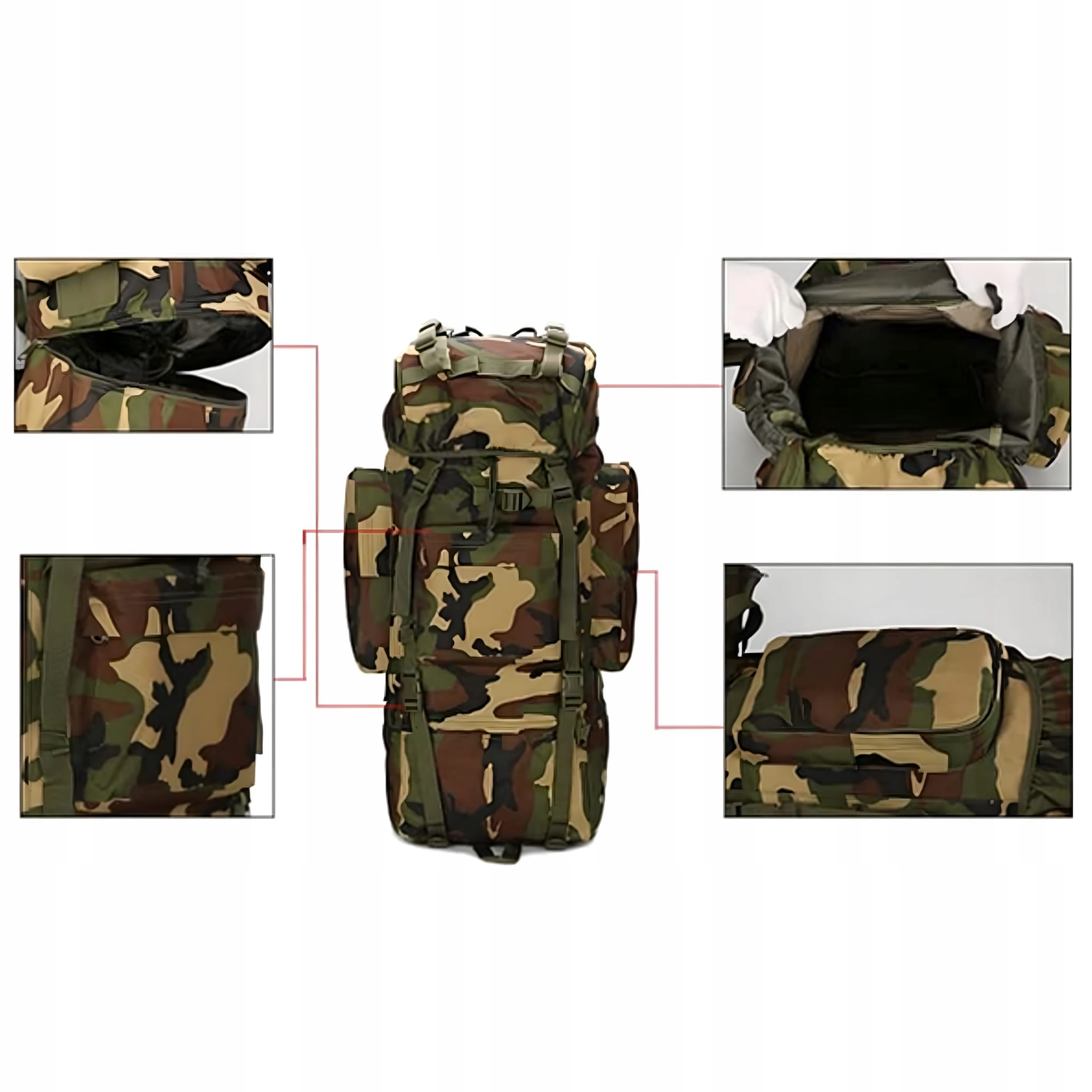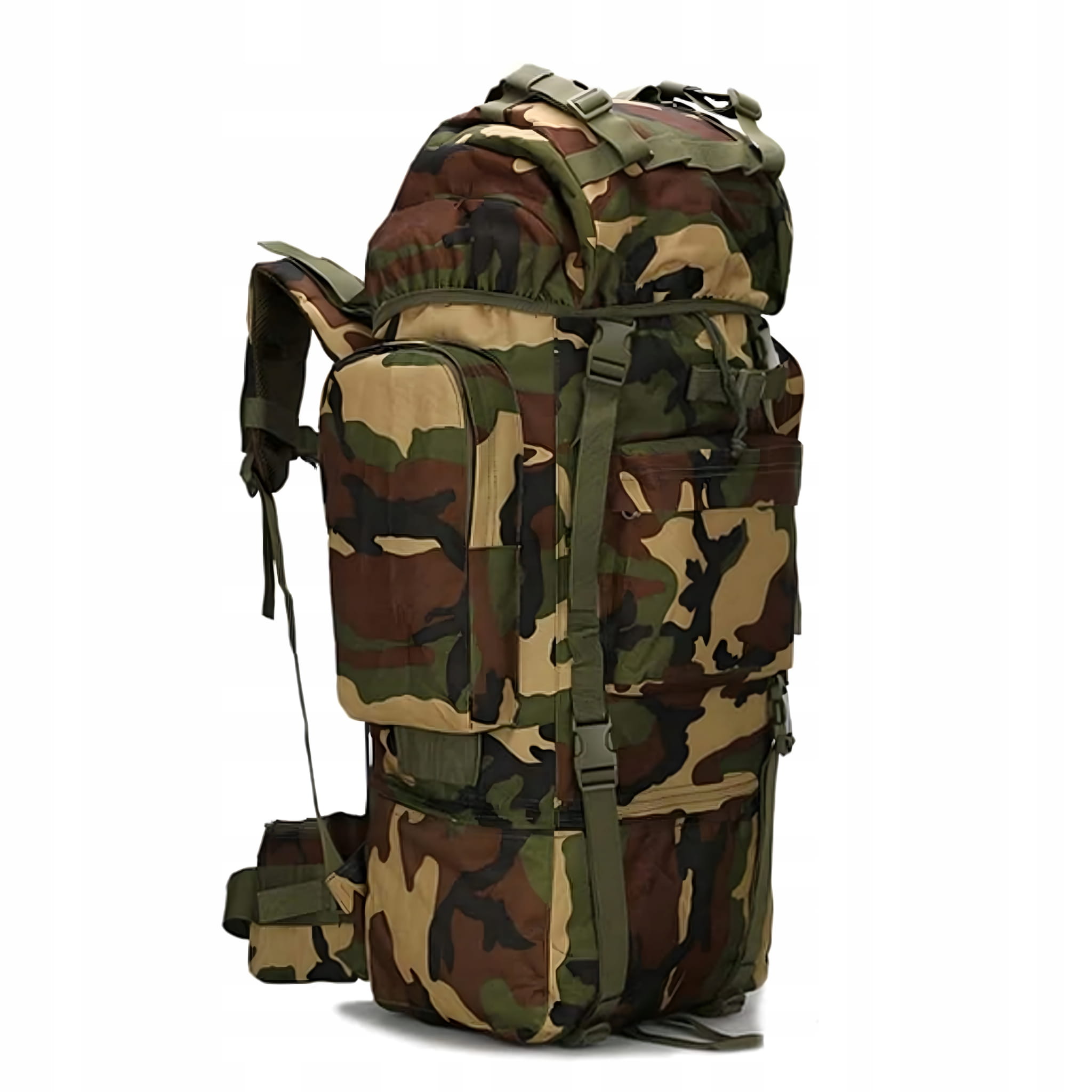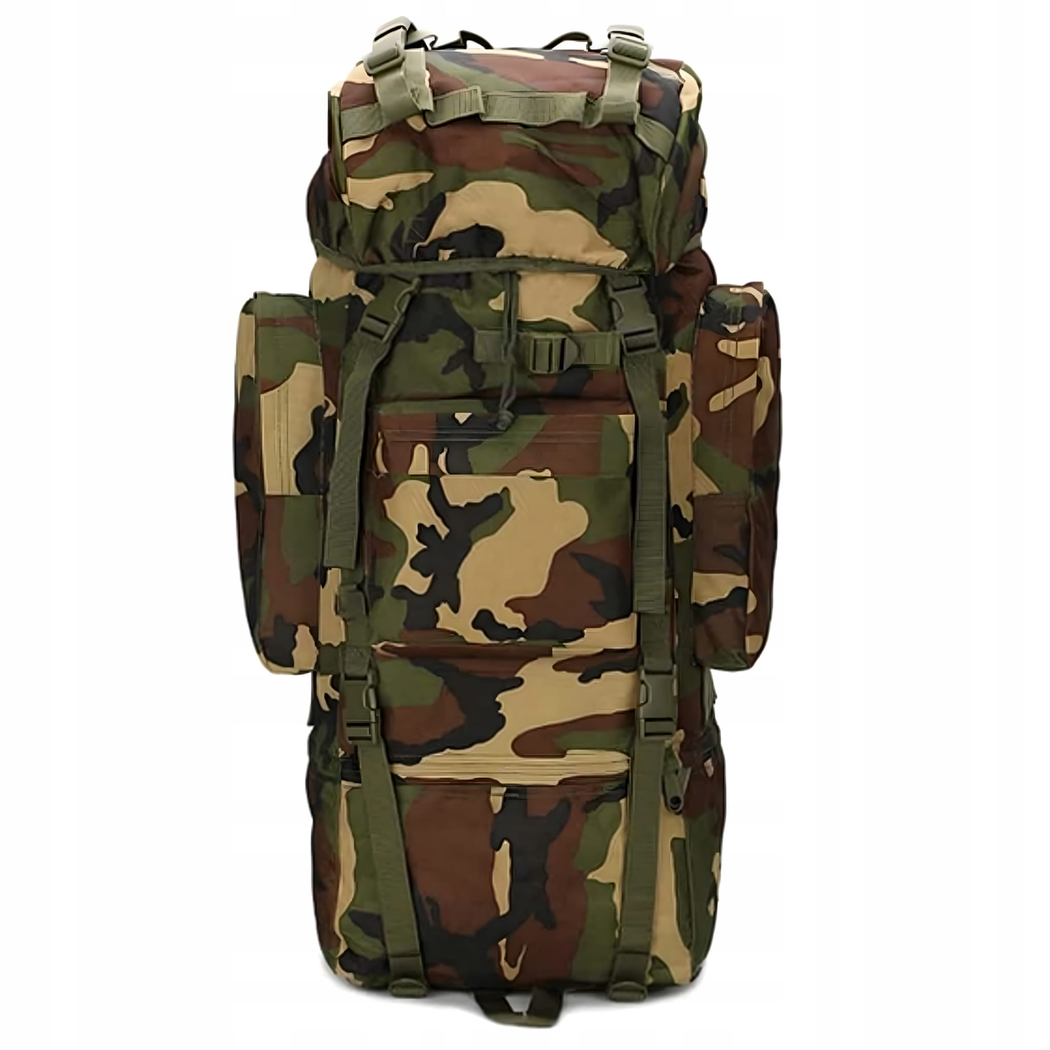 Plecak Taktyczny 65L - Plecak ten został wykonany z wysokiej jakości Poliestru 800D. Charakteryzuje się pojemnością wynoszącą 65 litrów i posiada dużą komorę główną z rękawem. Plecak jest wyposażony w regulowany pasek w talii, kołnierz ze sznurkiem, wiele pasków wzmacniających, wytrzymały uchwyt do noszenia na górze oraz stelaż. Na przedniej części znajdują się dwie kieszenie. Na każdym z boków znajdziemy po jednej kieszeni. Plecak oferuje dużą przestrzeń do noszenia i jest idealny do zastosowań wojskowych, myśliwskich, campingowych czy turystycznych.