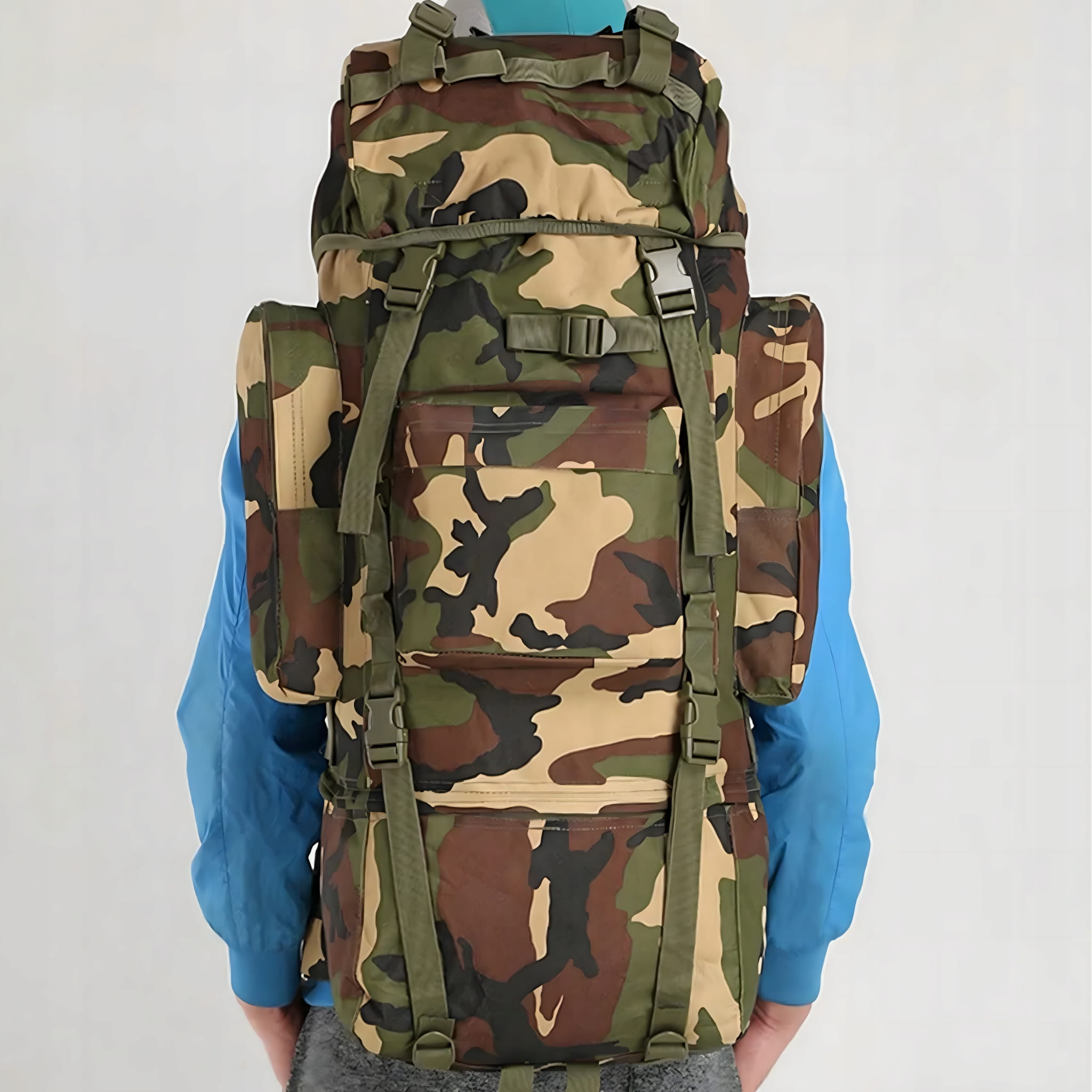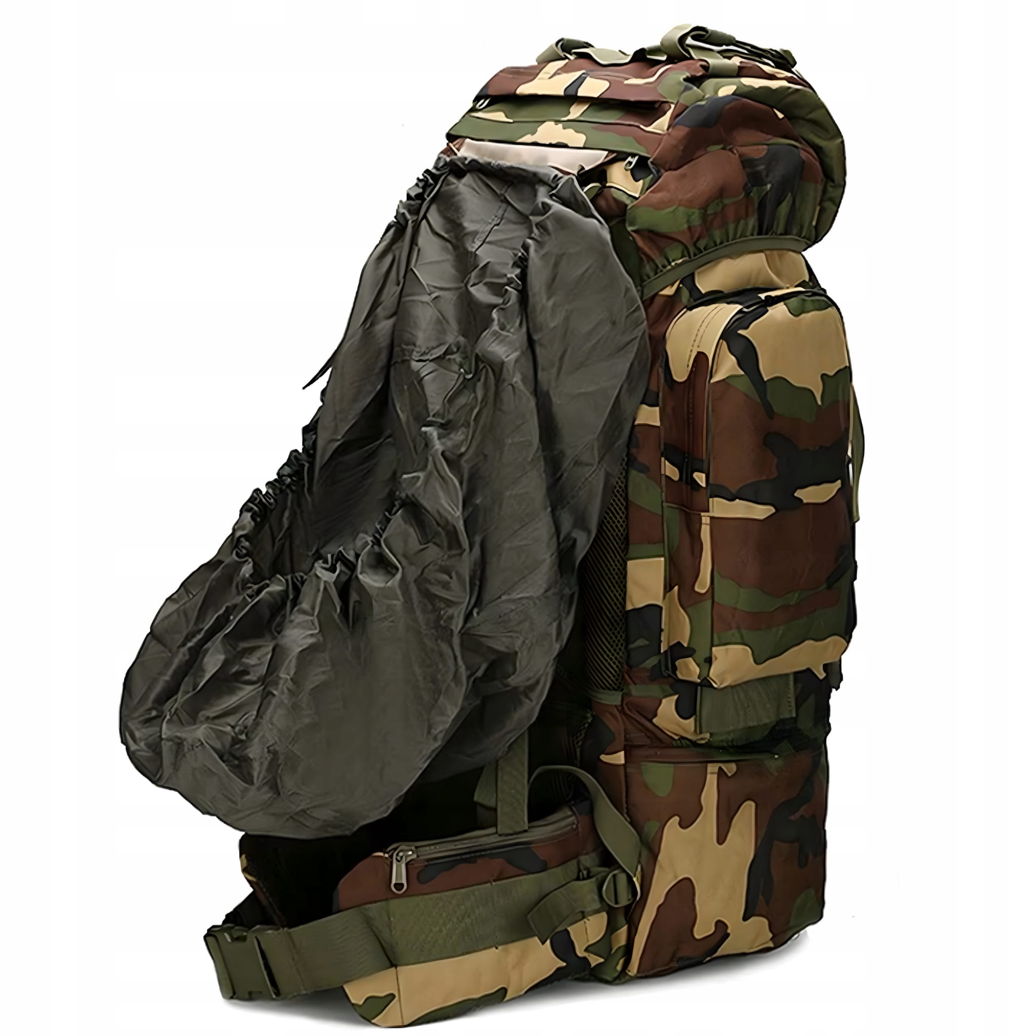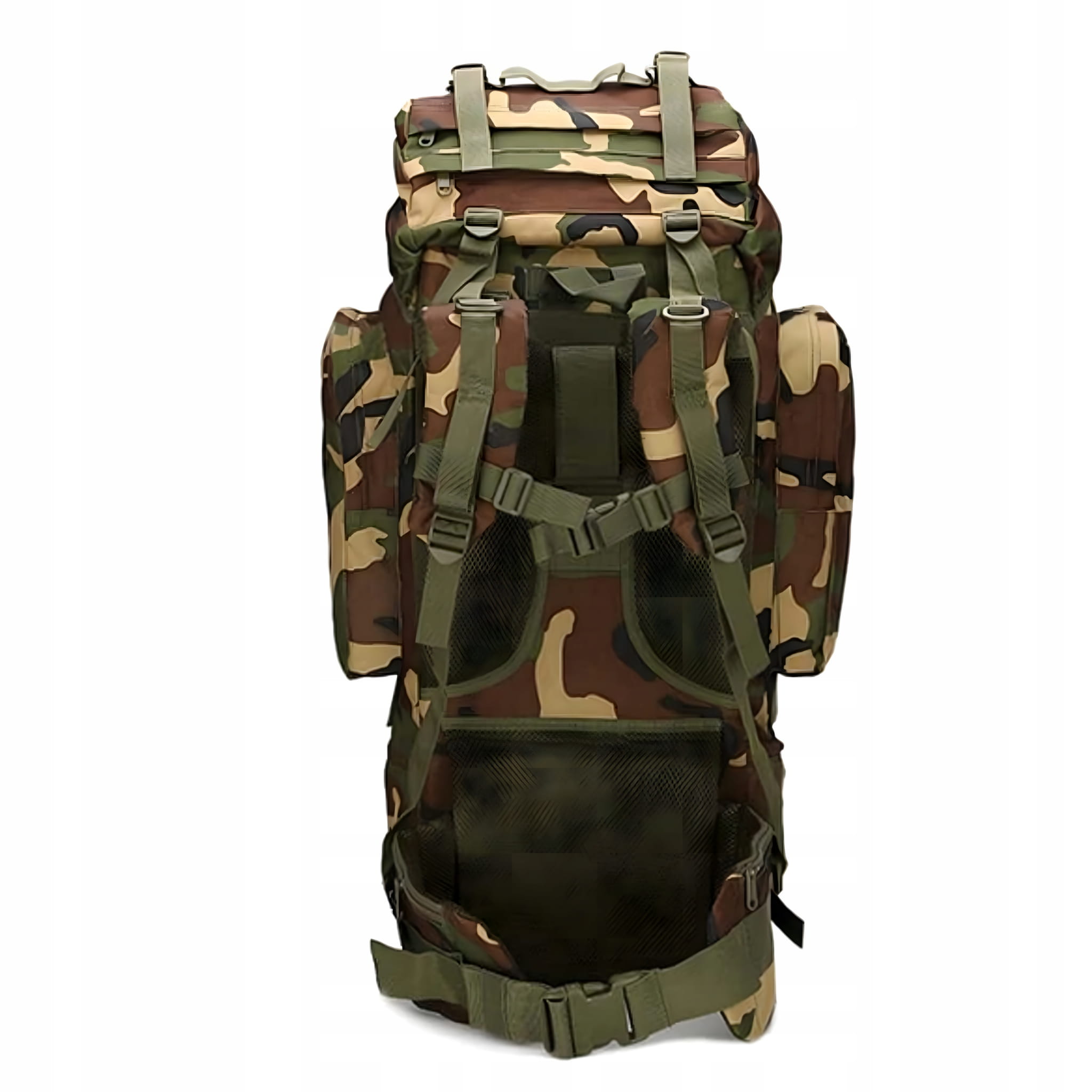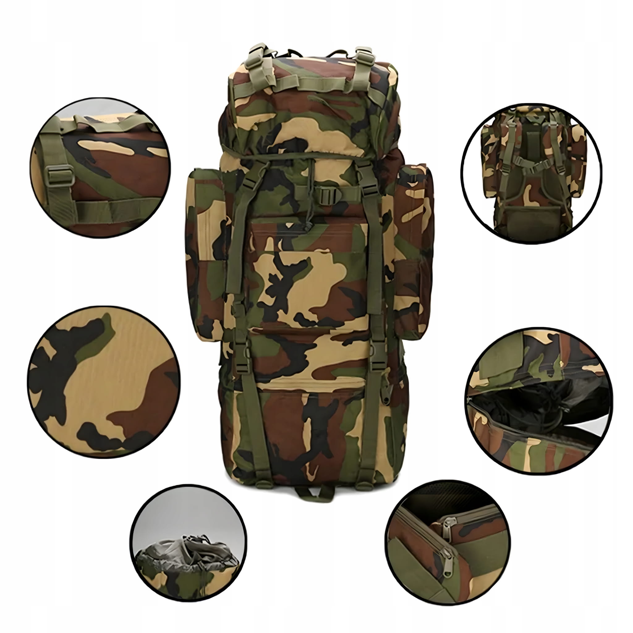 Plecak Taktyczny 65L - Plecak ten został wykonany z wysokiej jakości Poliestru 800D. Charakteryzuje się pojemnością wynoszącą 65 litrów i posiada dużą komorę główną z rękawem. Plecak jest wyposażony w regulowany pasek w talii, kołnierz ze sznurkiem, wiele pasków wzmacniających, wytrzymały uchwyt do noszenia na górze oraz stelaż. Na przedniej części znajdują się dwie kieszenie. Na każdym z boków znajdziemy po jednej kieszeni. Plecak oferuje dużą przestrzeń do noszenia i jest idealny do zastosowań wojskowych, myśliwskich, campingowych czy turystycznych.