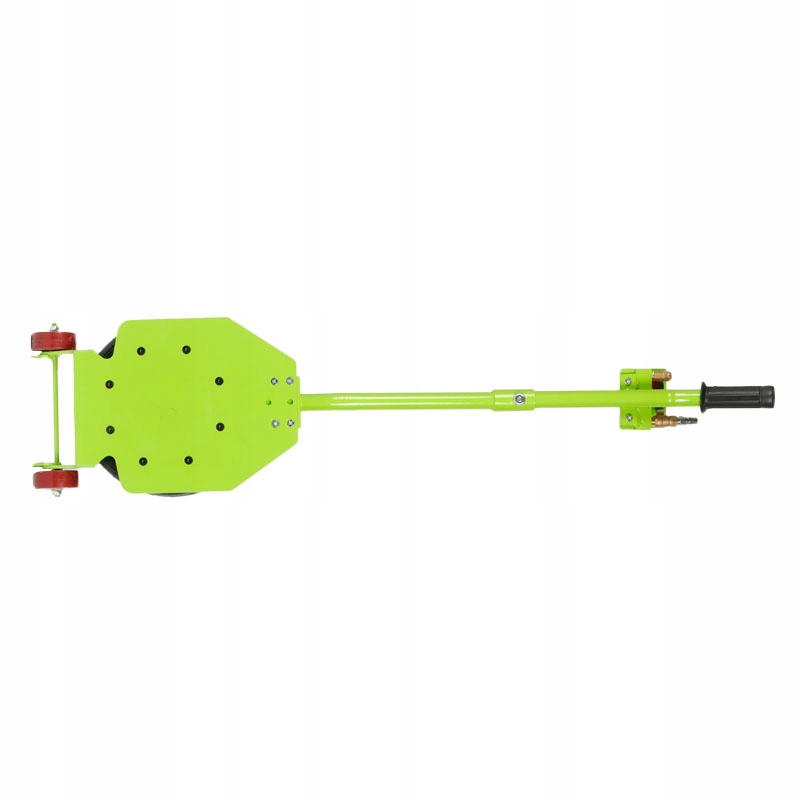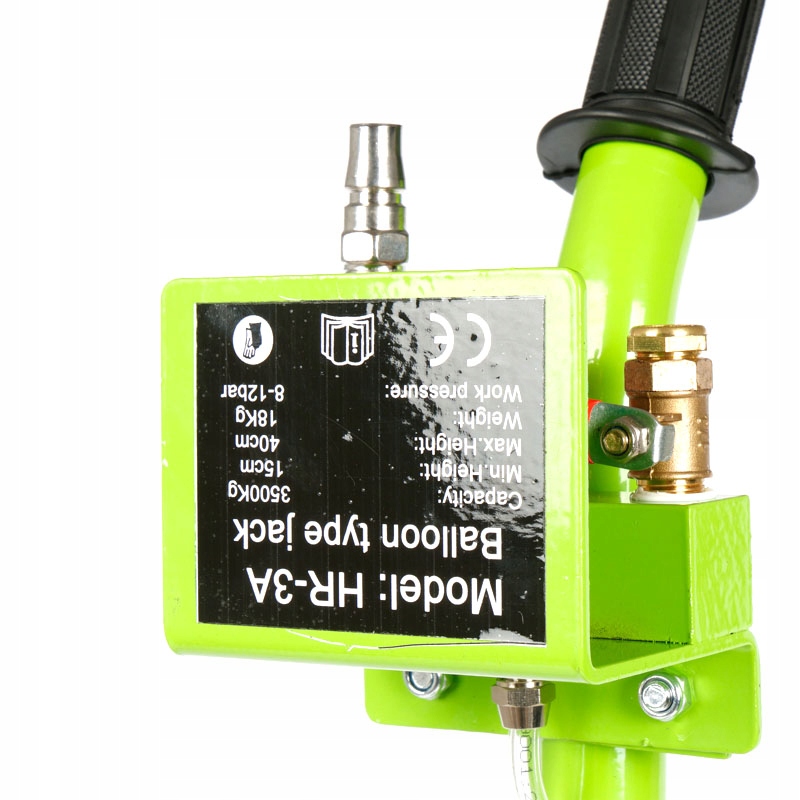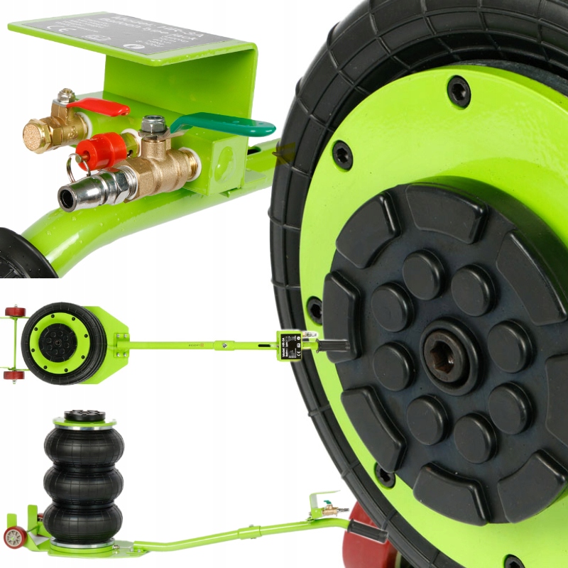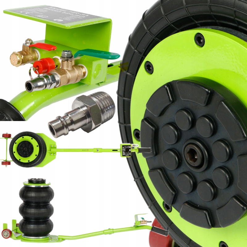 Podnośnik wyposażony w zawory wlotowy i wylotowy umożliwia bezpieczne odłączenie źródła powietrza po napompowaniu, eliminując ryzyko niekontrolowanego opadnięcia.