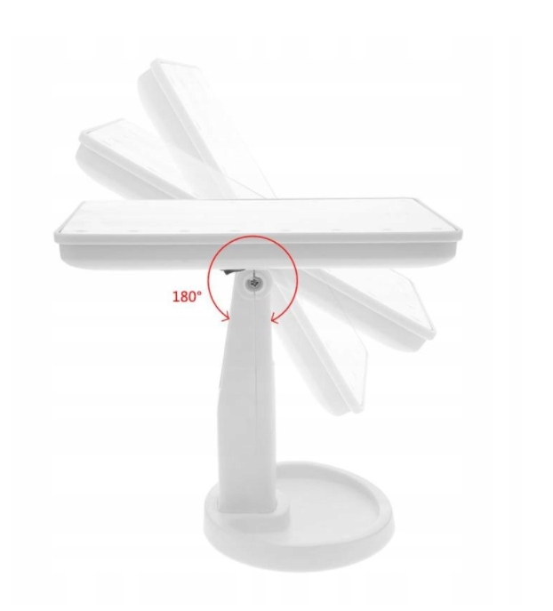 Posiada praktyczną półeczkę na drobiazgi w podstawie lusterka. Jest ono w pełni regulowane - w płaszczyźnie 180 stopni, co czyni je jeszcze bardziej uniwersalnym i elastycznym. Umożliwia to jego dogodne ustawienie zależnie od warunków oświetleniowych czy własnej potrzeby. Lusterko posiada funkcję doświetlenia, co znacznie ułatwia wykonywanie makijażu twarzy.