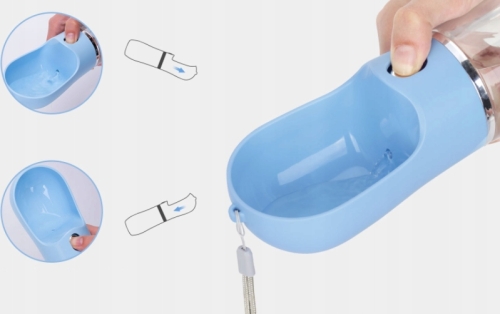 Praktyczna butelka na wodę dla psa. Idealnie sprawdzi się podczas dłuższych spacerów lub wycieczek z pupilem. Poidło wyposażone jest w przycisk blokady, dzięki czemu woda nie wyleje się w sposób niekontrolowany. Butelka składa się z dwóch części. Aby napełnić miseczkę wodą należy nacisnąć przycisk i przechylić butelkę w kierunku