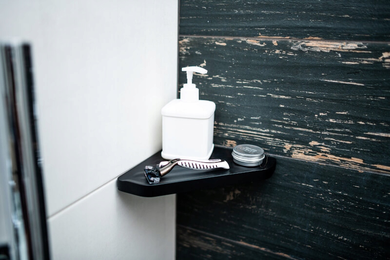 W strefie kąpieli, czyli pod prysznicem i nad wanną, przydatne będą modele z otworami w spodzie, umożliwiającymi swobodny przepływ wody i zapobiegającymi jej zbieraniu się na dnie półki. Wygodnym udogodnieniem są niewielkie haczyki służące do powieszenia małych ręczników, myjek kąpielowych czy tarek do stóp.