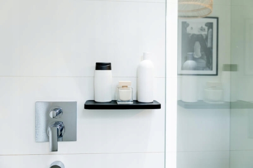 W strefie kąpieli, czyli pod prysznicem i nad wanną, przydatne będą modele z otworami w spodzie, umożliwiającymi swobodny przepływ wody i zapobiegającymi jej zbieraniu się na dnie półki. Wygodnym udogodnieniem są niewielkie haczyki służące do powieszenia małych ręczników, myjek kąpielowych czy tarek do stóp.