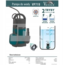 Pompa zanurzeniowa VP719 to pompa do wody brudnej stosowana do pompowania wody ze zbiorników, studni oraz szybów. Przydatna jest w szczególności do opróżniania beczek, składanych basenów ogrodowych itp., a także zasilania zraszaczy podlewających przydomowe ogródki lub trawniki. Pompy nie należy wykorzystywać do pompowania wody pitnej. Produkty marki Vander to linia urządzeń dla wymagających majsterkowiczów, którzy cenią sobie niezawodność, jakość i wygodę pracy. Narzędzia, które znajdują się w ofercie w pełni wyposażą każdy warsztat zarówno w podstawowe elektronarzędzia jak i specjalistyczne maszyny do zadań specjalnych. Nowe technologie, wykorzystywane przez producenta zapewnią, że urządzenia te będą służyć wiele lat a praca nimi będzie czystą przyjemnością. Narzędzia marki Vander nie boją się wyzwań a poszerzająca się gama dostępnych modeli otwiera przed użytkownikiem nowe możliwości.