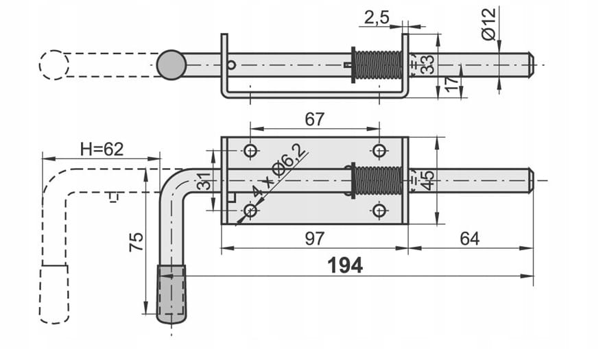 RYGIEL DO DRZWI 200 mm Z ZACZEPEM ZASUWA ZE SPRĘŻYNĄ OCYNK