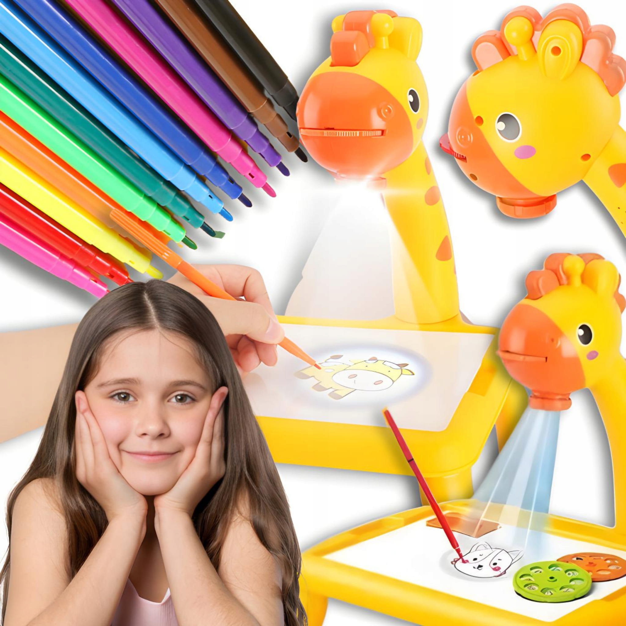 Specjalny projektor w kształcie głowy żyrafy wyświetla na tablicy obrazki, które dzieci obrysują za pomocą dołączonych mazaków.