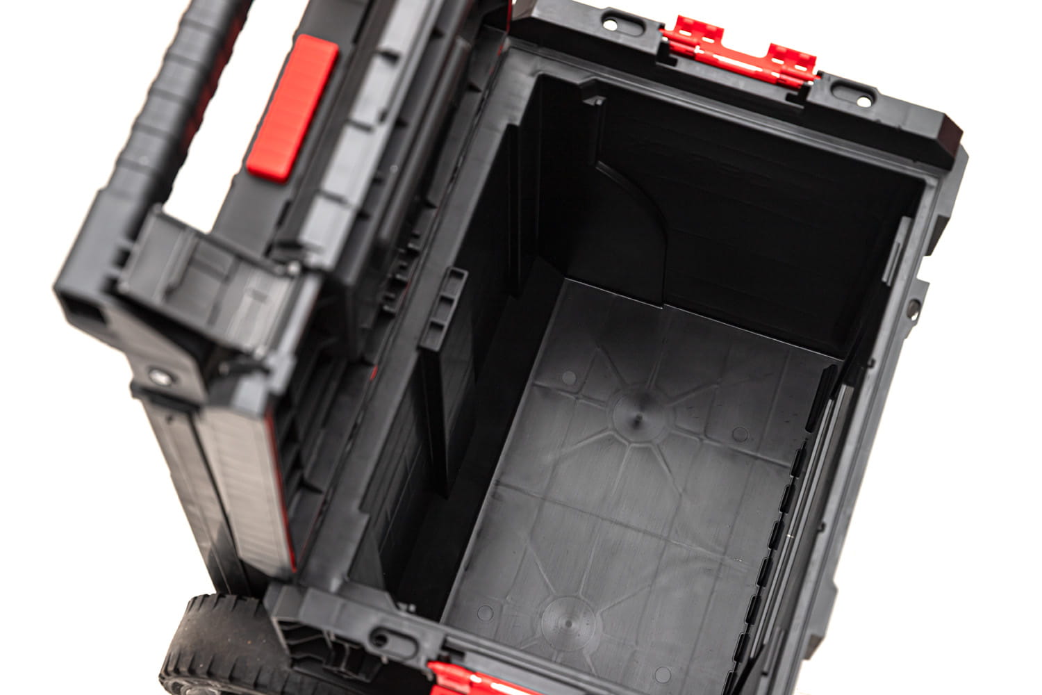 ▶ Skrzynia posiada również wygodny podest pod stopę, co zapewnia pewny chwyt i umożliwia łatwe poruszanie się nawet na ograniczonej przestrzeni. Duże koła o średnicy 22 cm oraz szerokości niemal 6 cm posiadają grube gumowe opony, co gwarantuje doskonałą przyczepność nawet w trudnych warunkach terenowych.
