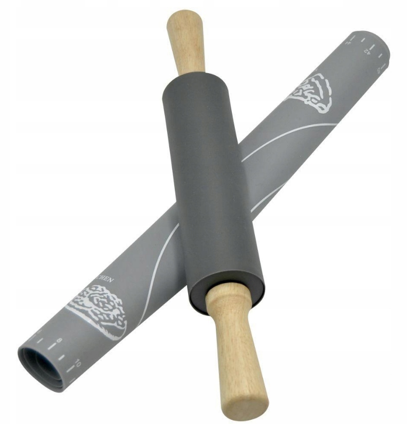 - Silikonowy wałek wykonany z wysokiej jakości tworzywa, uchwyty drewniane, obrotowy, lekki i wytrzymały. Długość ok. 39 cm.