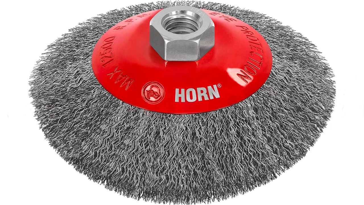 Falowany gęsty drut stalowy, karbowany. Szczotka firmy HORN. Doskonała jakość, wysoka wydajność przy czyszczeniu.